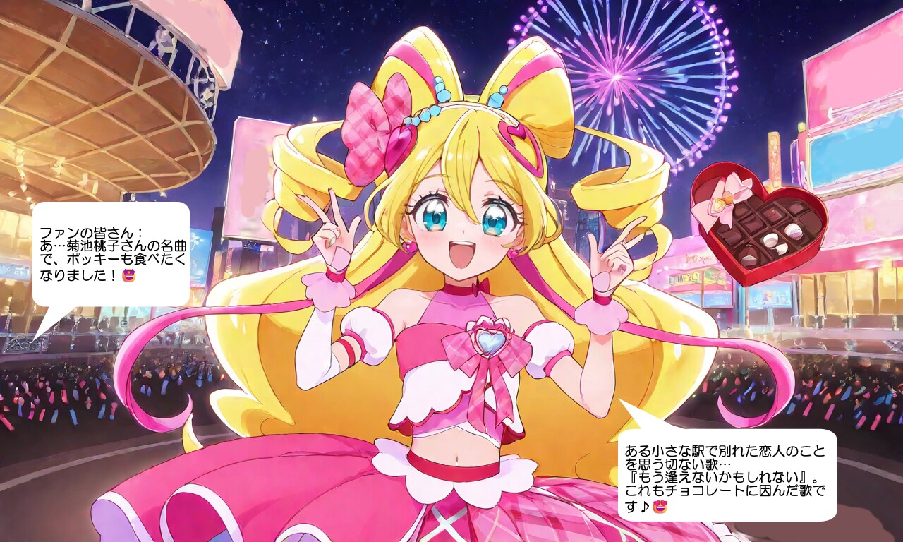 そこで、キュアアイドルが大阪市内の万博会場に近い屋外コンサート会場で、ファンにバレンタインデーチョコを配りながら歌うシーンを描いてみました。