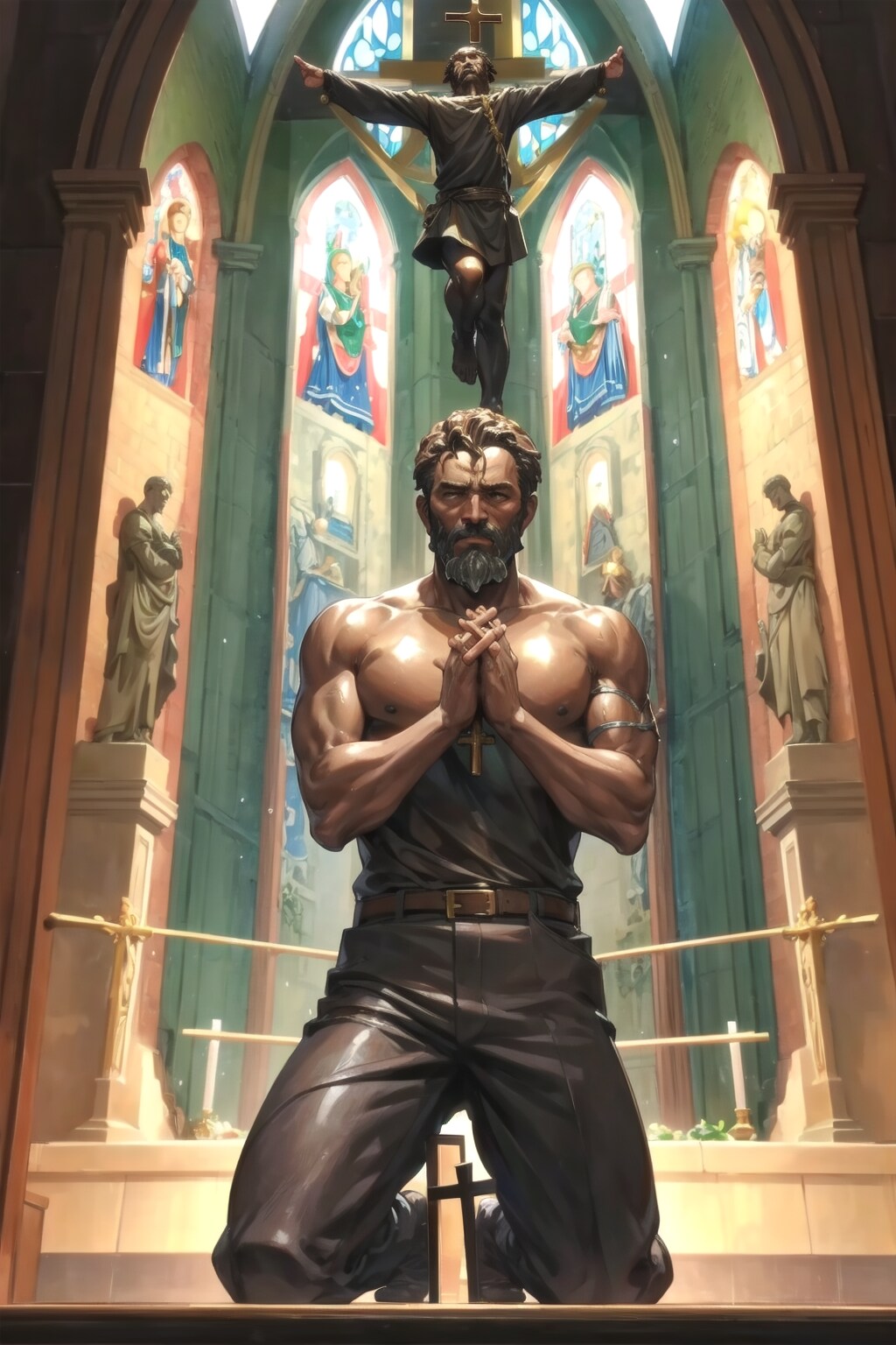 男性の銅像は十字架のような物の前で跪き、両手を組んでお祈りを捧げているようなポーズをしている。