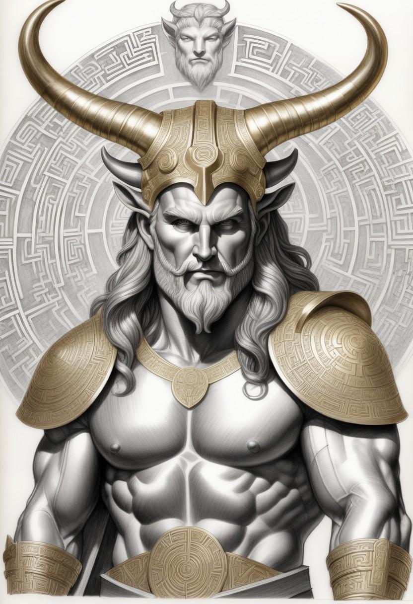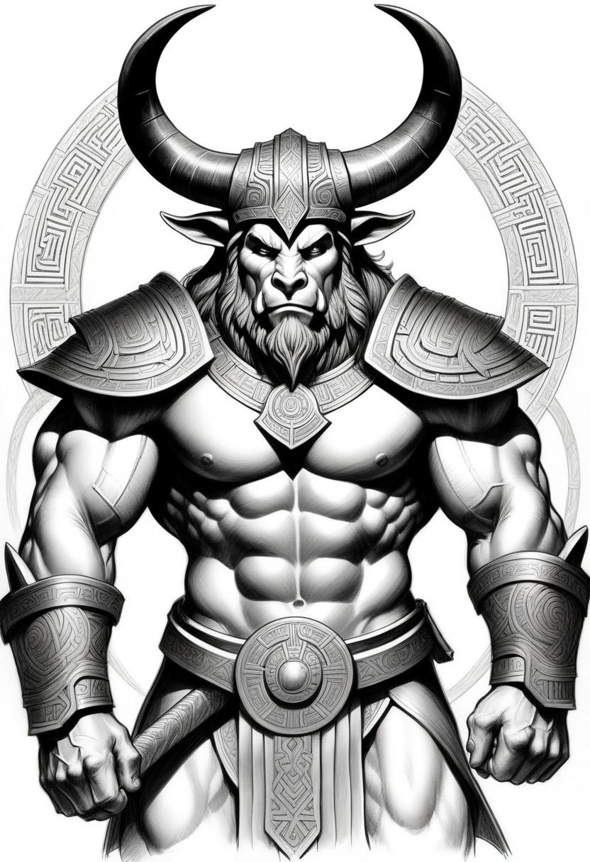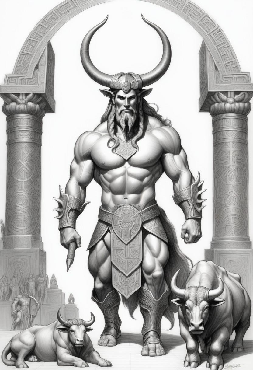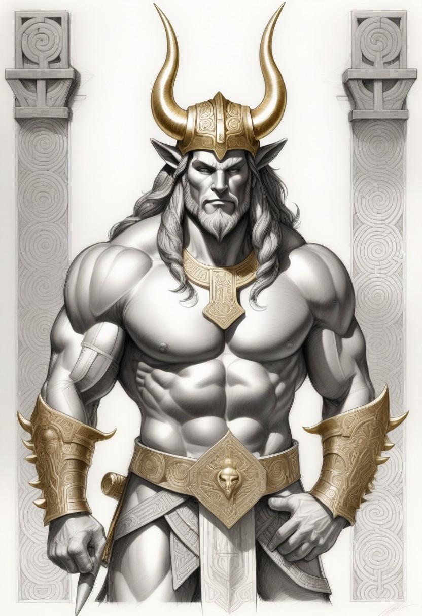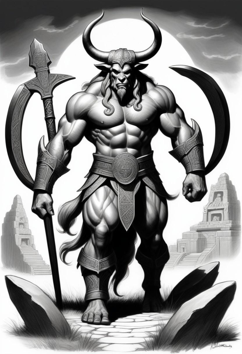 Mhuur appears as a huge Minotaur with golden horns. He likes large, gold and ivory statues and his worshippers go to great lengths to satisfy his vanity. A god of strength and loud sounds, he has some rivalry in both of these fields with the Orc god Kra. The conflict is also made worse by the fact that Mhuur wields a large battle axe that it is rumored to have been stolen from Kra's temple. One day, the two giants will meet on the battlefield and they will determine who can bellow the loudest, who has the strongest arms, and who has the right to wield that battle-axe.