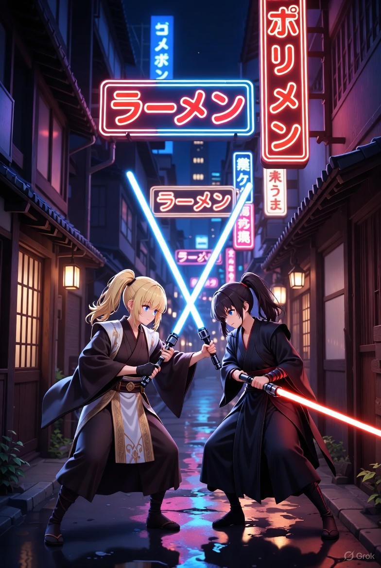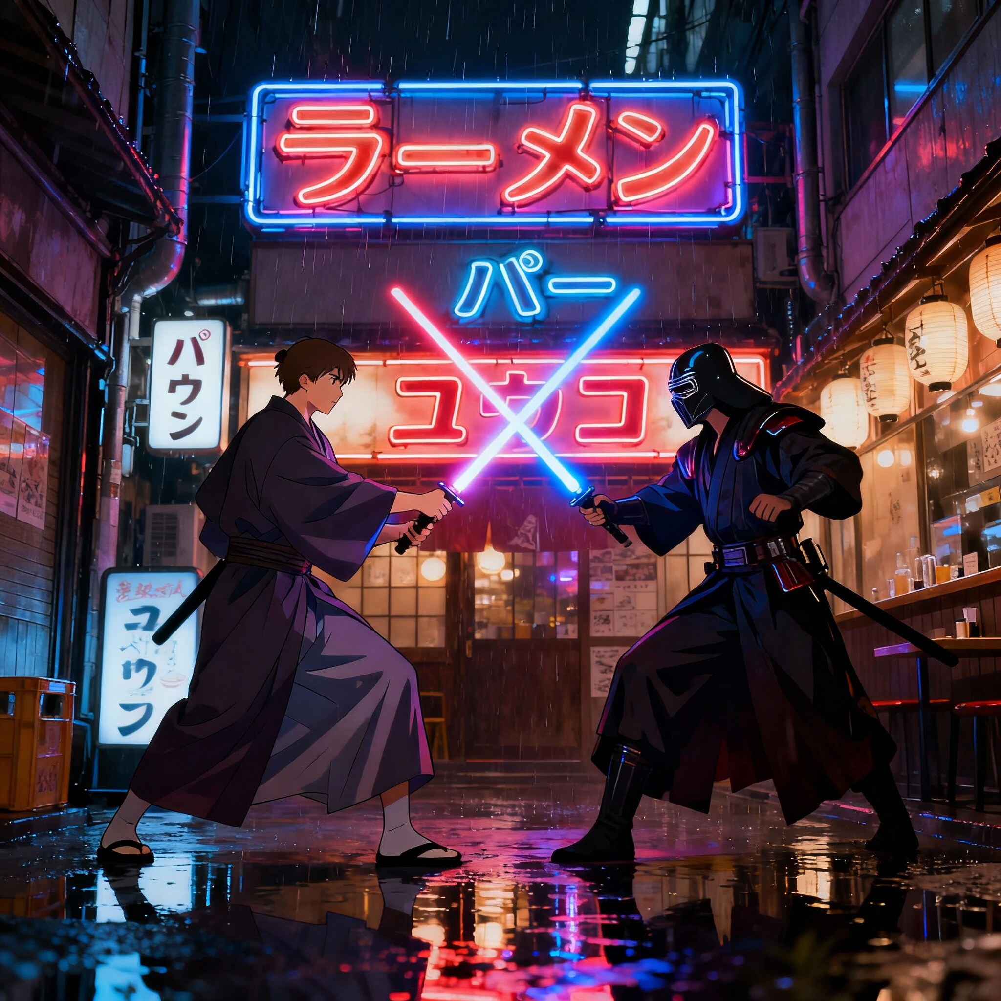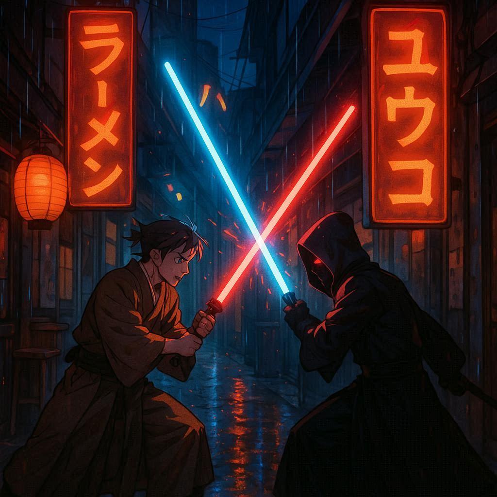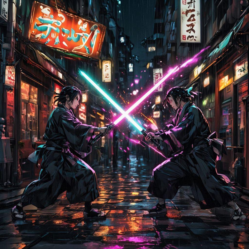 未来のサイバーシティのような背景でライトセイバーで切り結ぶ