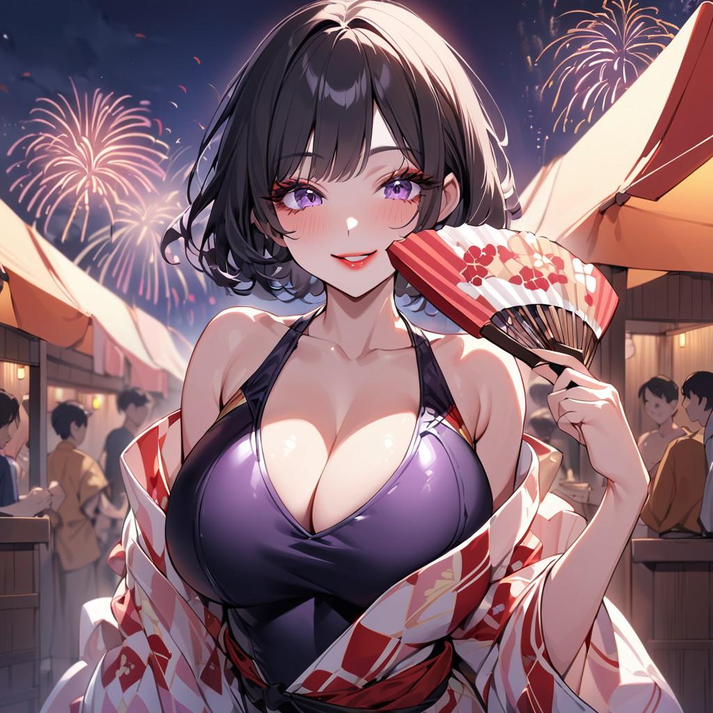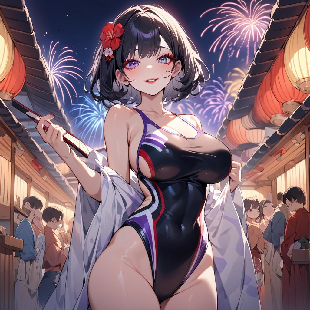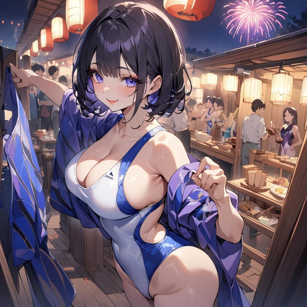 浴衣風の競泳水着の彼女と夏祭りで出店や花火を楽しむシーン!