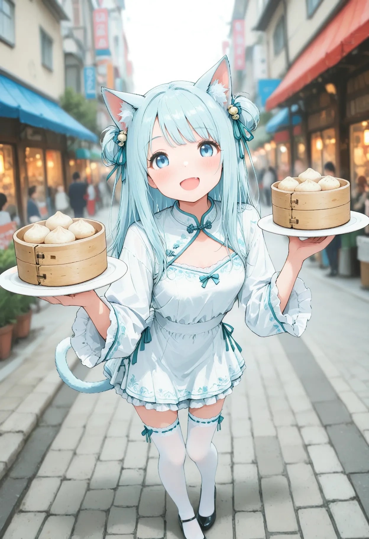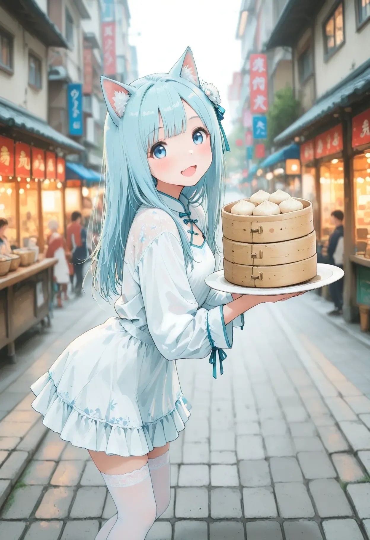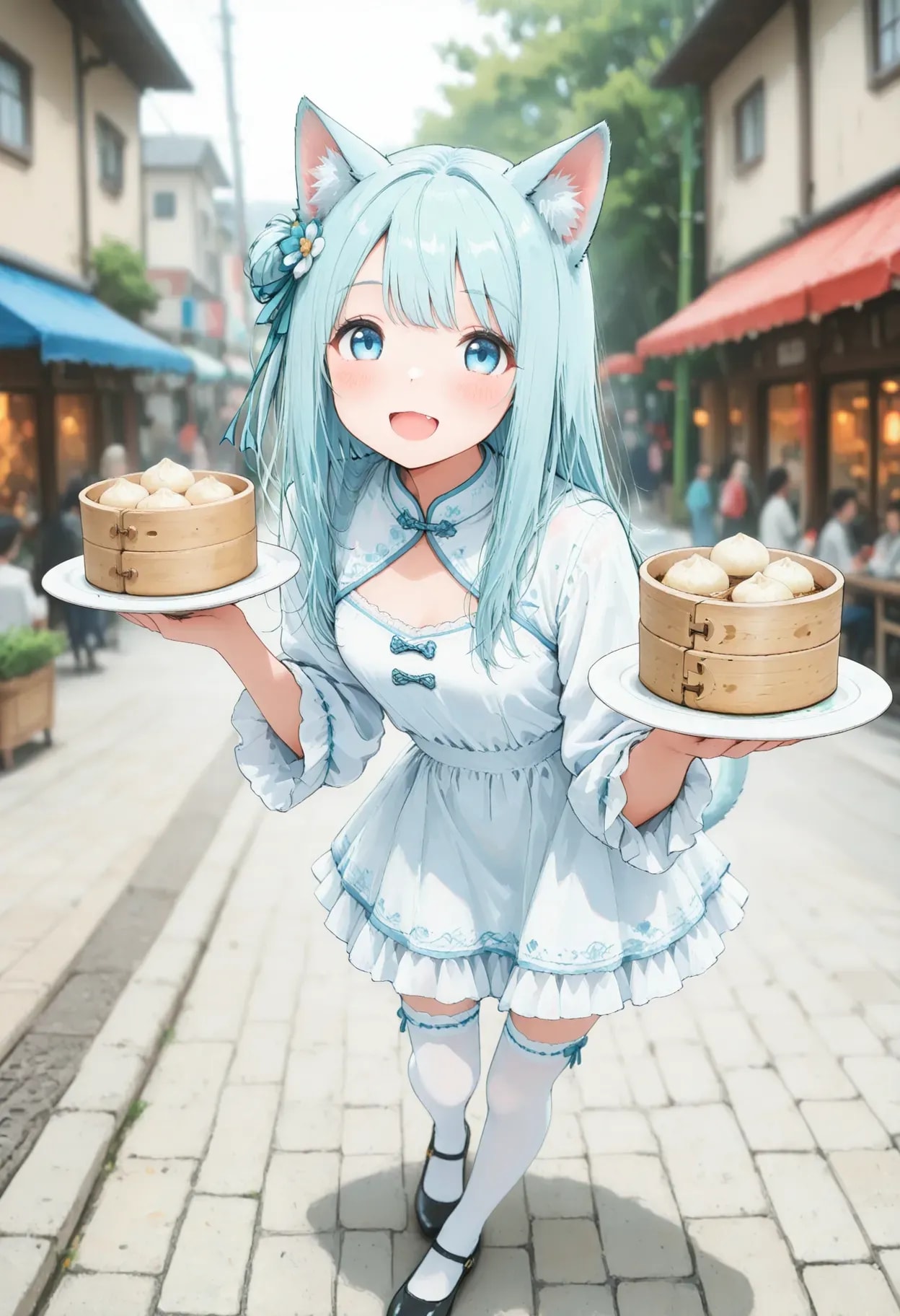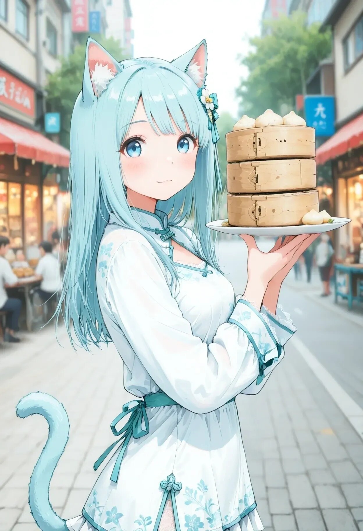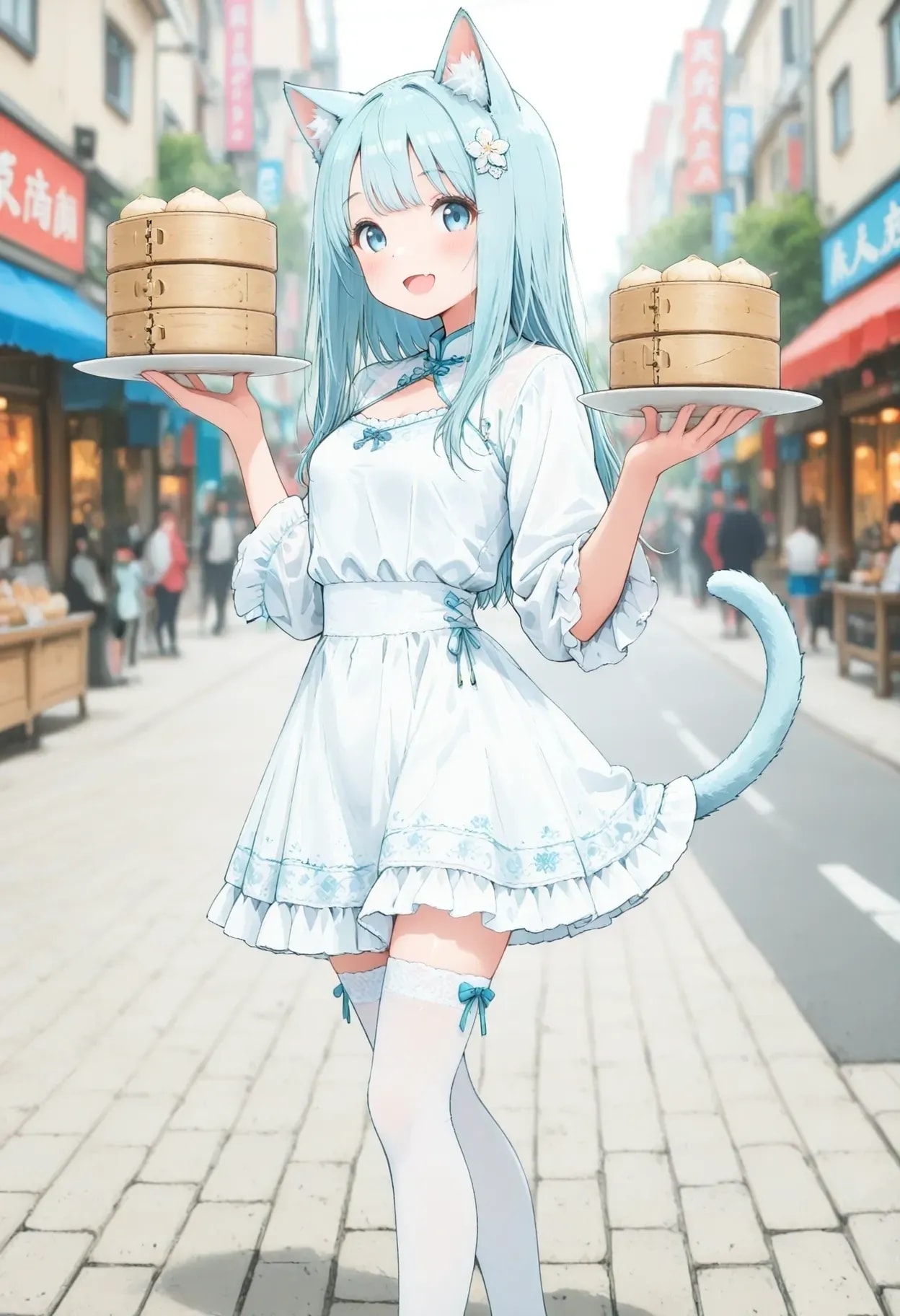 点心の出前をお届け中の中華風フリルワンピ猫娘ちゃん🐱