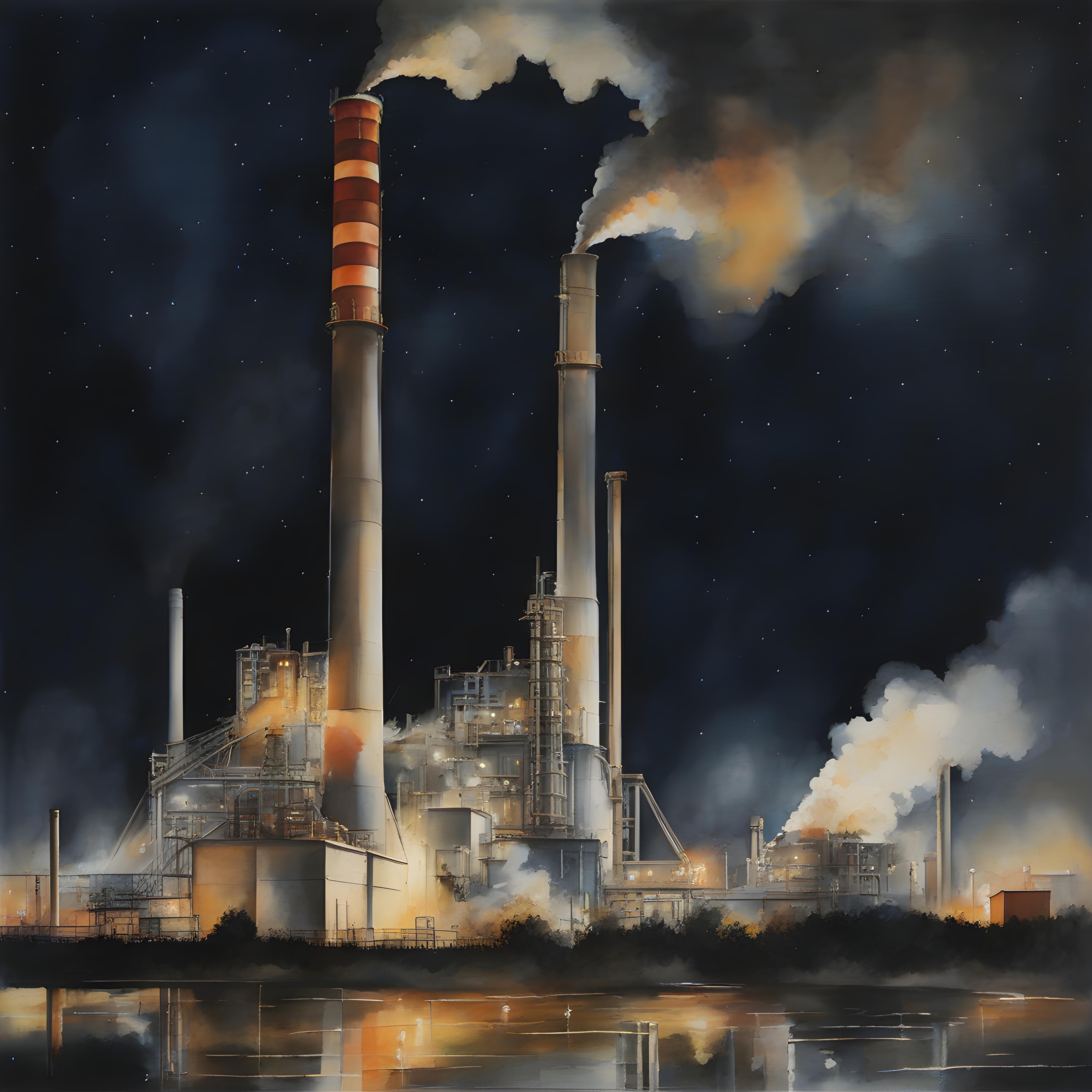 工業地帯にそびえる2本の煙突、そこから排出される煙