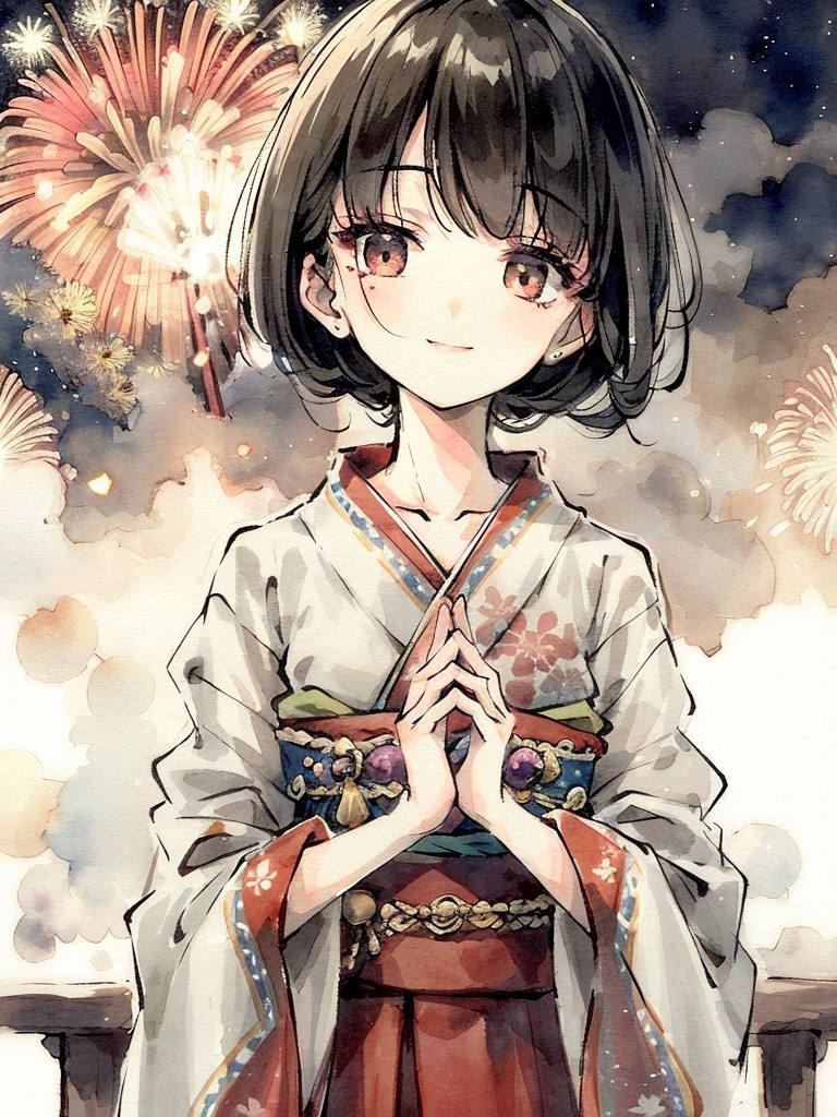 上がる花火と微笑む少女