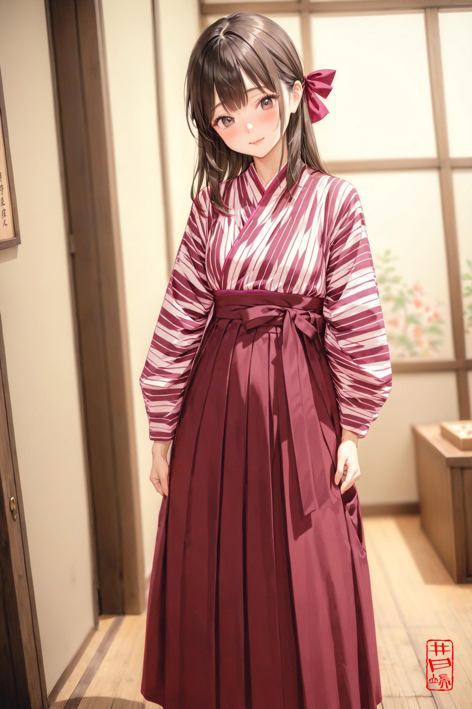 ですので、今回は髪型をロング&半結び(ハーフアップ)にし、矢絣(やがすり)柄や袴の色をハイカラVer.で緋色にしてみました。