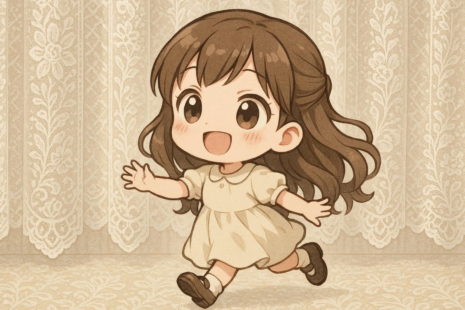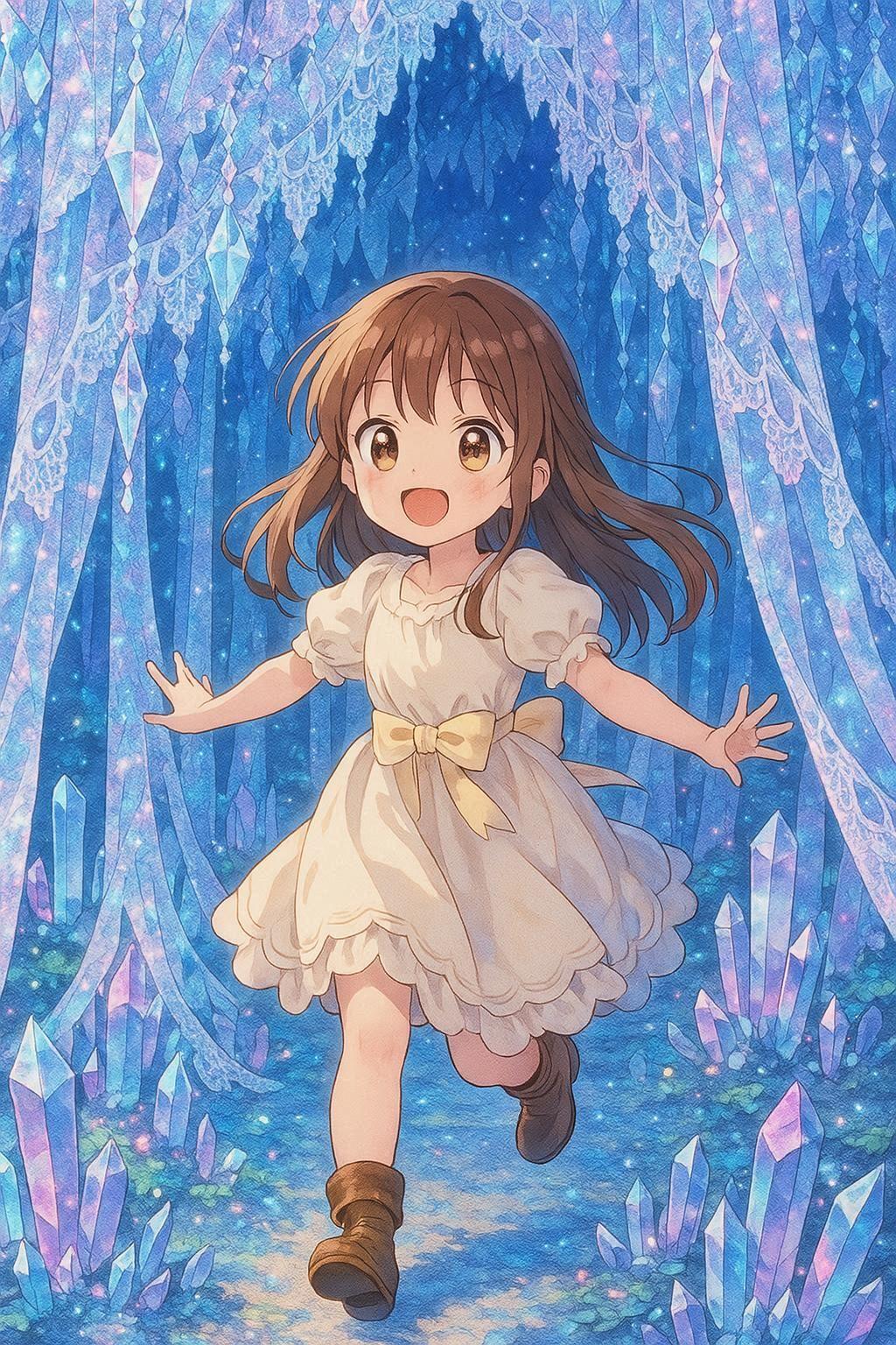 アニメイラスト。水晶の森。カーテンレースを羽織って走っている笑顔のちびちゃん。