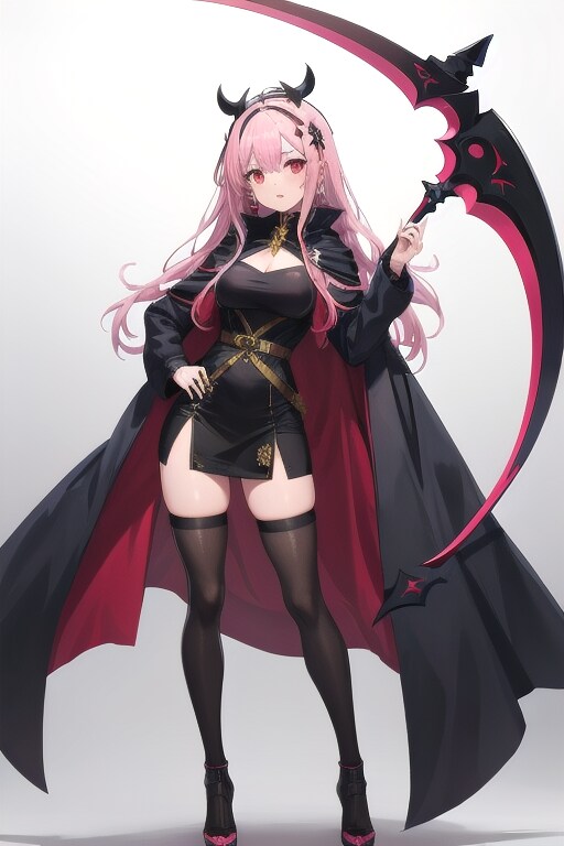 森カリオペ、死神、ラッパー、石竹色の髪、赤い目、ロングヘア、頭からベール、黒いマント、黒と金のタイトドレス、太腿までのスリット、大きな鎌、白い肌、全身、歌、完璧な五本指
