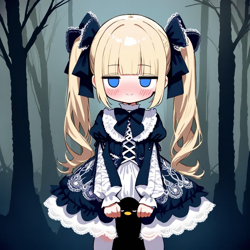 (jitome,big blue eyes,blushing smile),(blunt bangs,blonde hair,twintails hair,hair ribbon),