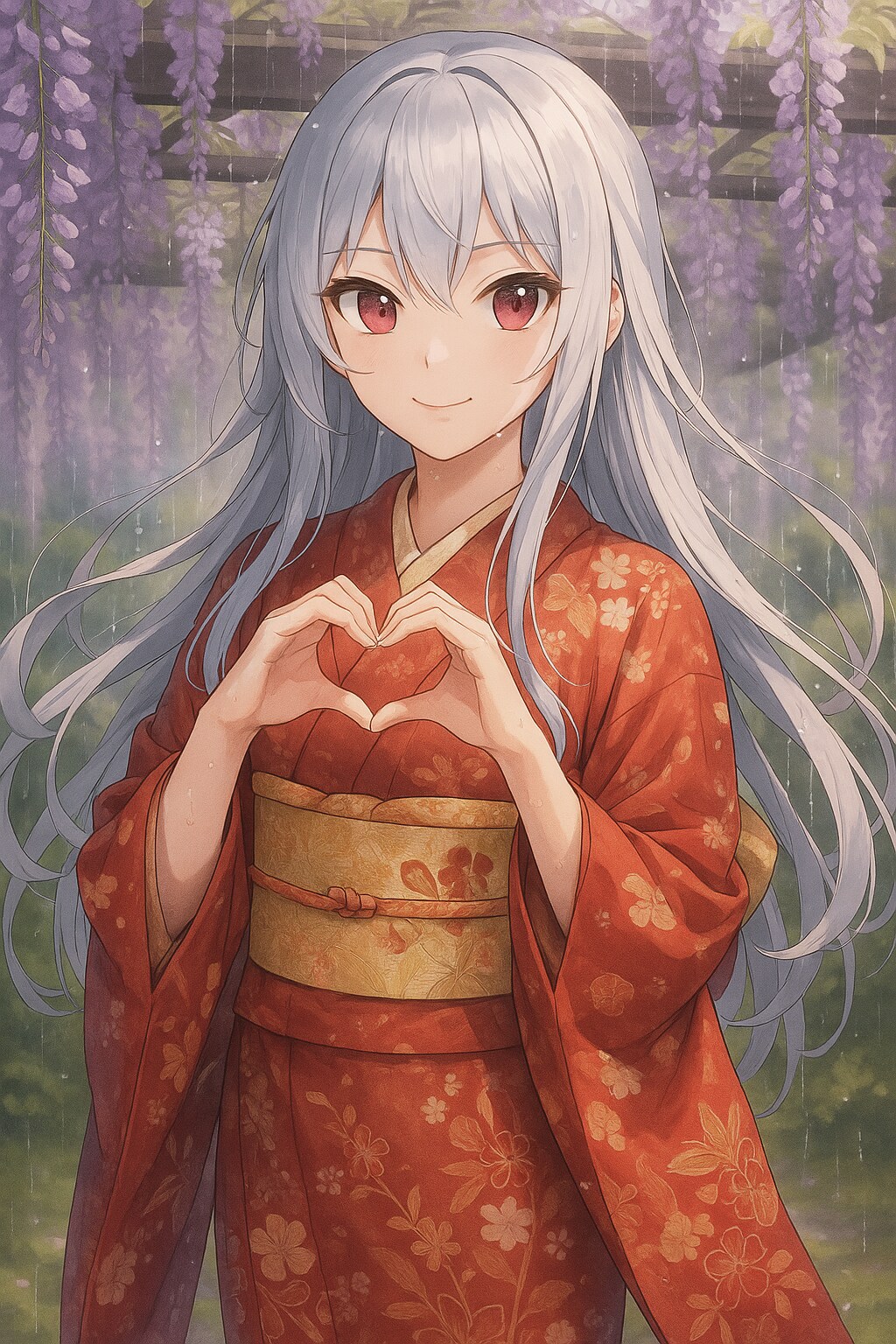 春の雨がそっと降る藤棚の下、彼女は赤い着物で静かに佇んでいた。