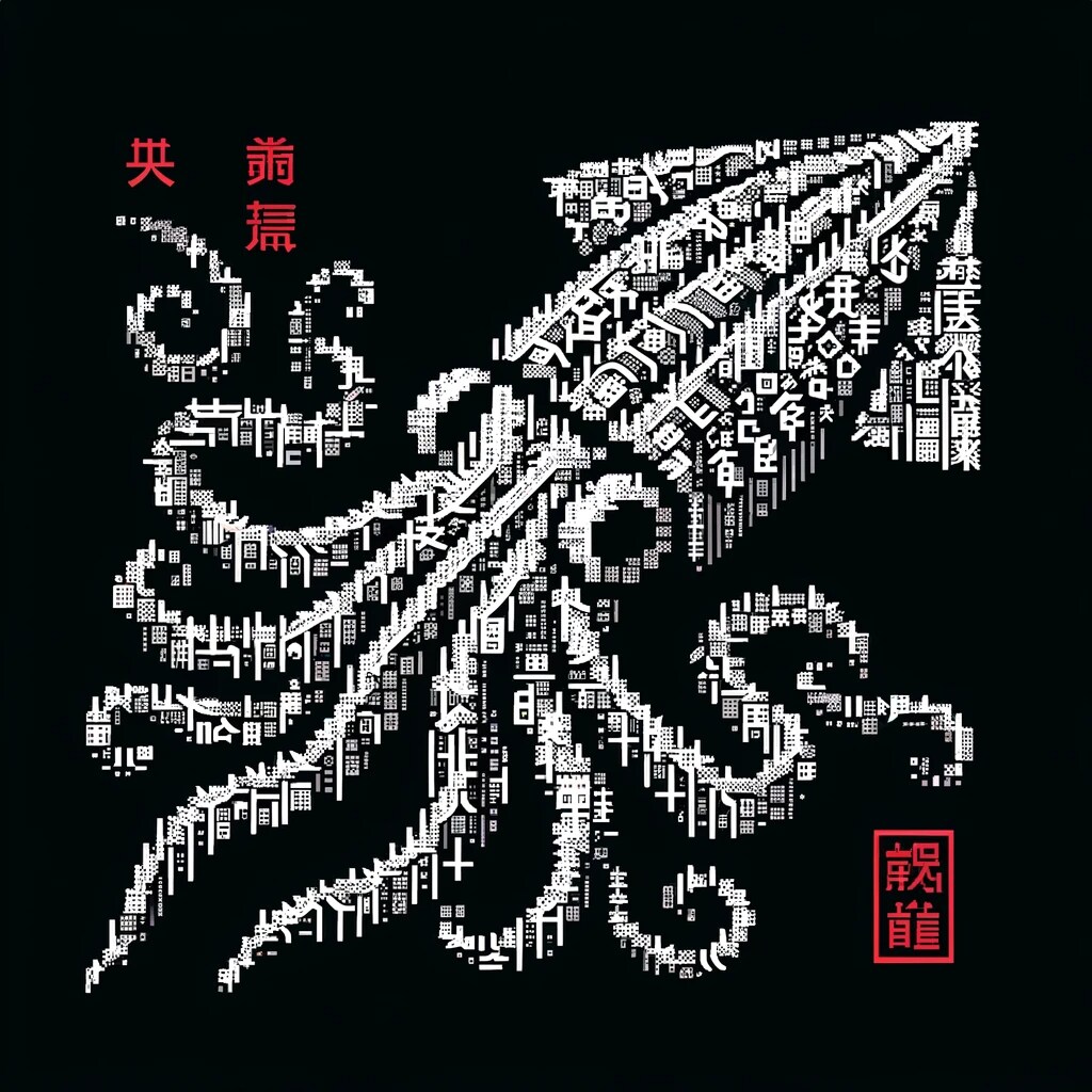 「全体が漢字で構成されたイカの複雑なアスキーアートの例を考えてください」