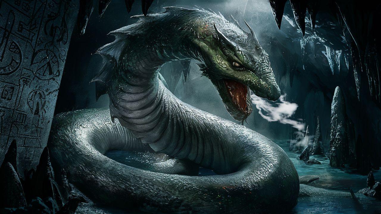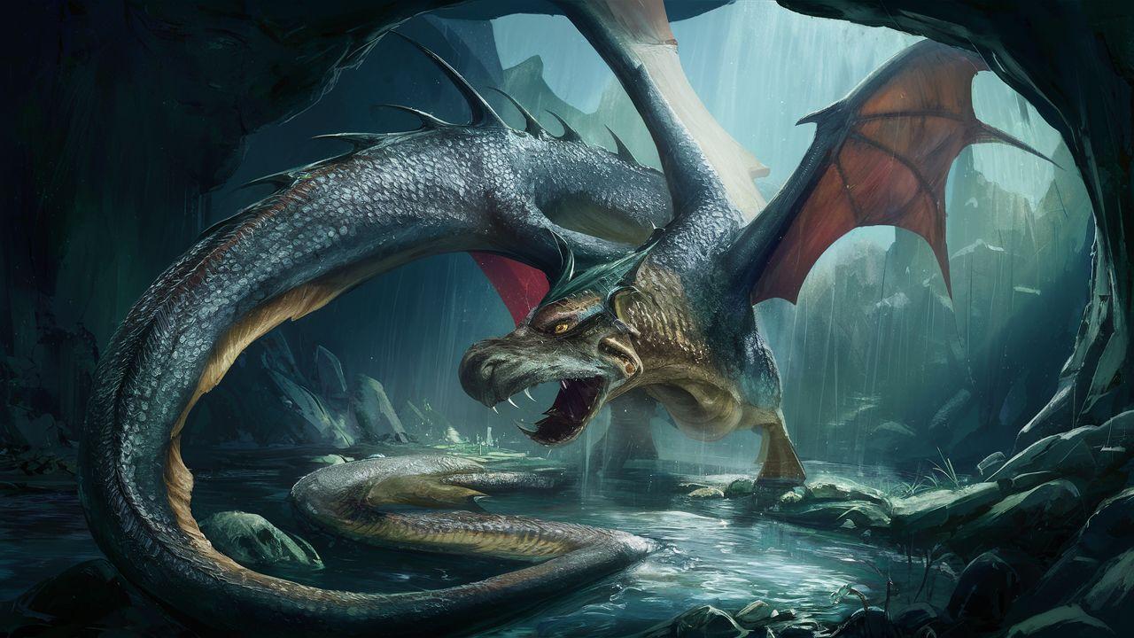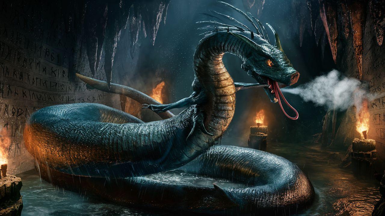 オリジナルプロンプトは「dracolisk, inside the cave, snort, wet scales」