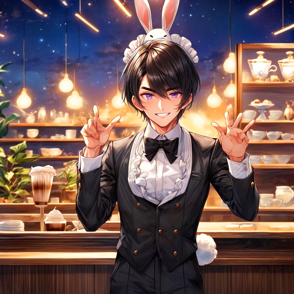 男性でバニー…どうしょうか迷いましたが、バニーボーイみたいなウェイターならありそうだなと思い、生成!