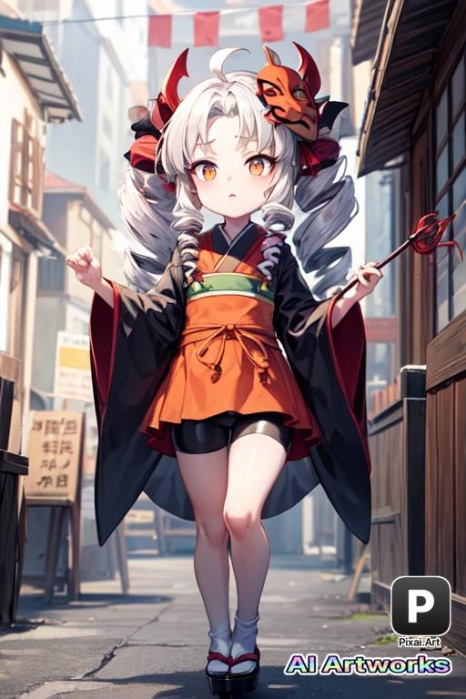 tuina-chan,voiceroid,outdoor,(1 girl),skinny albino girl, light pink voluminous twin drill hair,middle parted bangs,(twin drill hair:1.3), pure white skin,golden eyes,baby face,big face,Onmyoji,japanese exorcist, huge red amulet mask on her head, flat figure, An orange apron over a black kimono,bike shorts, high clogs,Holding a spear used in Japanese rituals,standing,