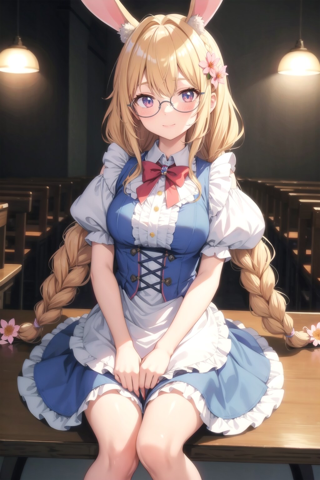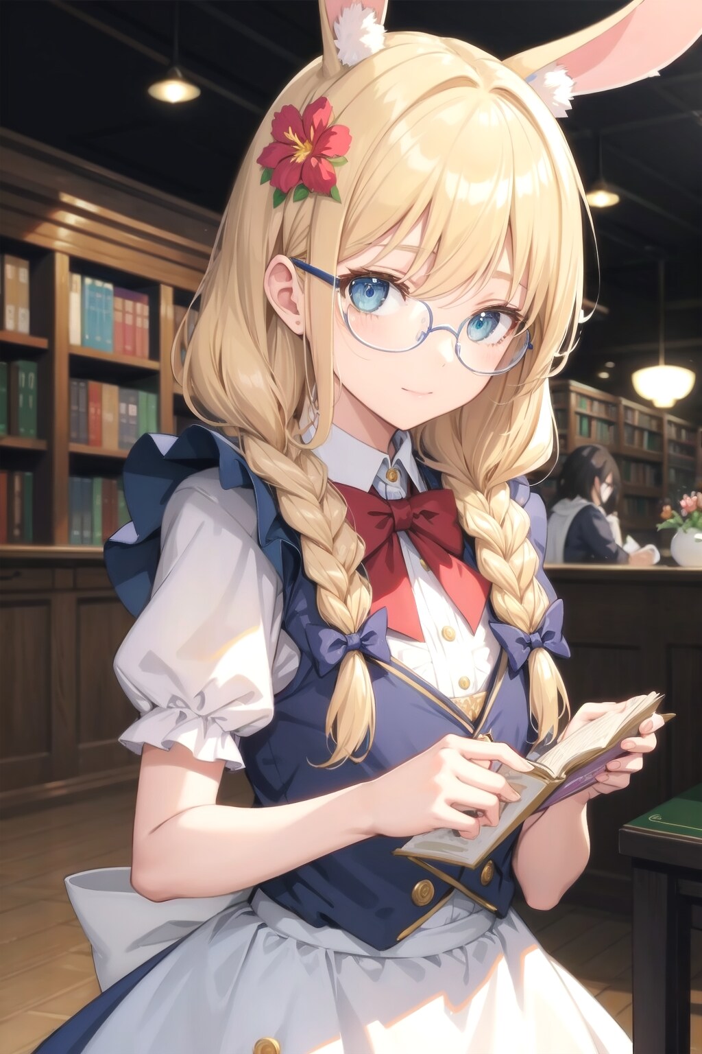 ○○の国のアリス企画への参加投稿です。最初は安直に「眼鏡三つ編みの国」とかでしたがいる人いる人みんな眼鏡三つ編み、というのもありでしたが多くの眼鏡三つ編みっ娘の中にアリス、という絵を作るのは自分にはまだ難しそうということで図書館の国になりました。金髪ロングヘア+三つ編みでしっかり金髪のロング三つ編みになって満足です(苦笑)。あと、外見をいじらないと意外と大人のアリスも出るのですねえ。