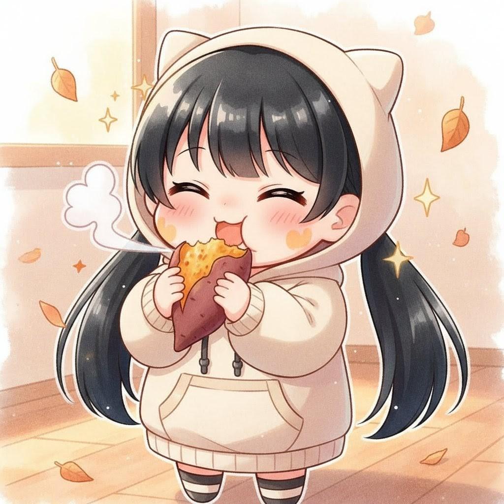 アニメスタイル、ハイクオリティ、最高傑作、ちびキャラ、かわいい女の子、ソロ、ロングヘア、ツインテール、黒髪、両手で握ったさつまいもを食べている、美味しそうに食べる、愛らしい』