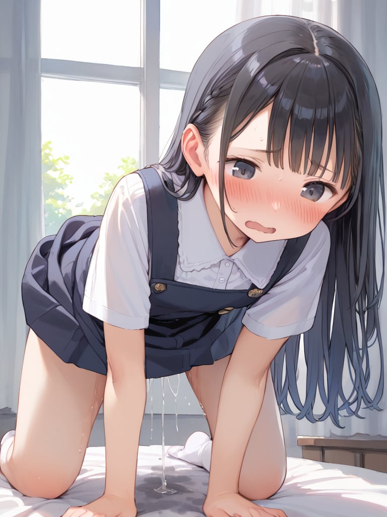 【リクエスト】吊りスカート長髪〇リJ〇ちゃんが教室で指オナ(四つん這い・前から)【5枚】