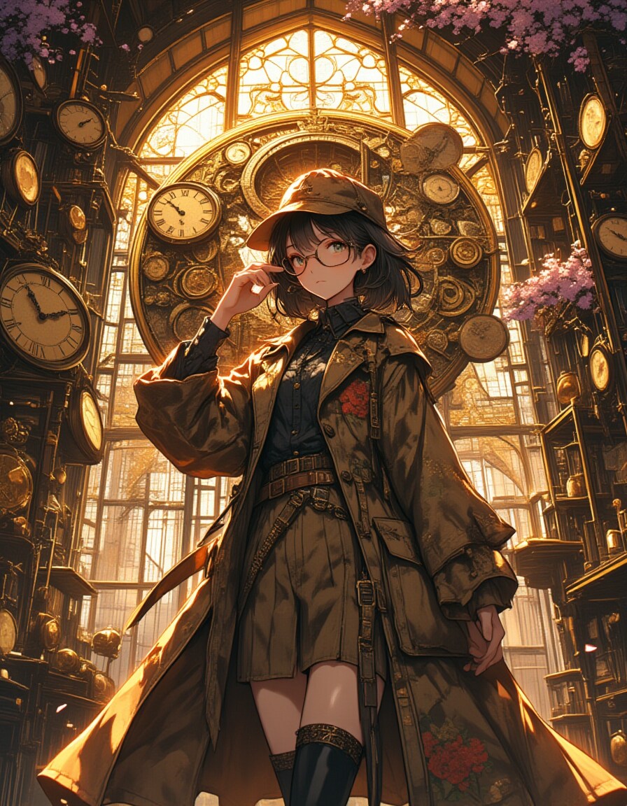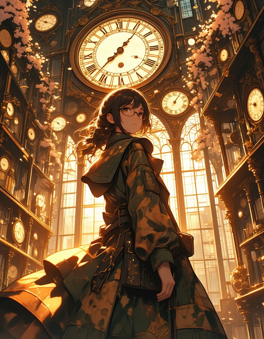 A captivating vertical illustration of a detective girl with glasses,elegantly posed inside a grand antique clock shop. She wears a stylish blend of modern and vintage attire,featuring a flowing patchwork-like coat with shimmering floral motifs. The shop is filled with towering shelves lined with ornate timepieces,intricate gears,and softly glowing clock faces. Golden light filters through stained-glass windows,casting a mesmerizing interplay of warm illumination and deep,enigmatic shadows. Delicate vines with blooming wisteria and cherry blossoms weave around the antique shelves,their petals drifting gently through the air. A massive,antique clock behind her creates a dramatic focal point,its surface partially adorned with intricate floral engravings. The rhythmic ticking of countless clocks blends with the faint rustle of petals,enhancing the dreamlike and sophisticated atmosphere.,