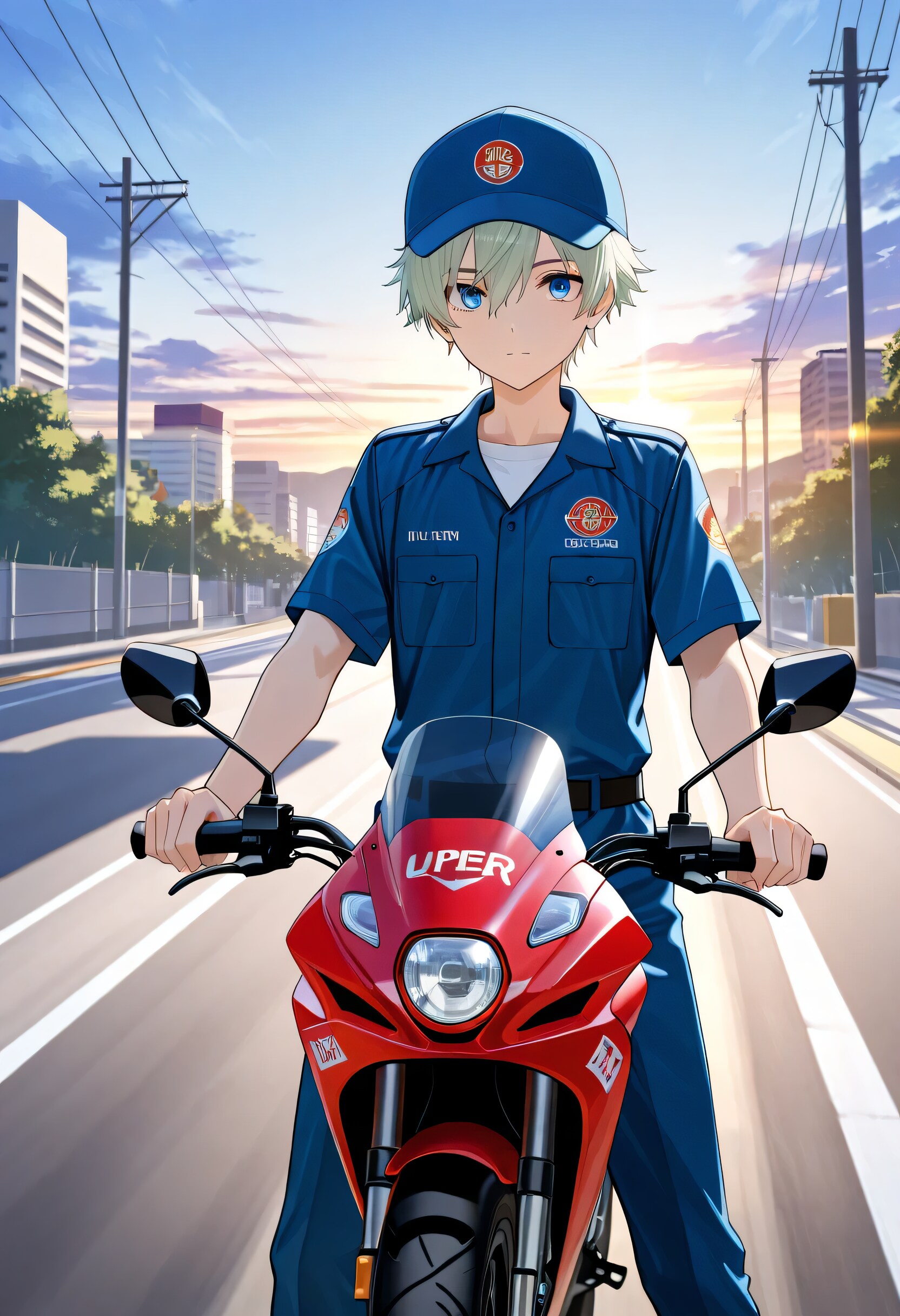 ソウカイ・ミントはバイクに乗って朝焼けあるいは夕焼けを背にして走り出す。