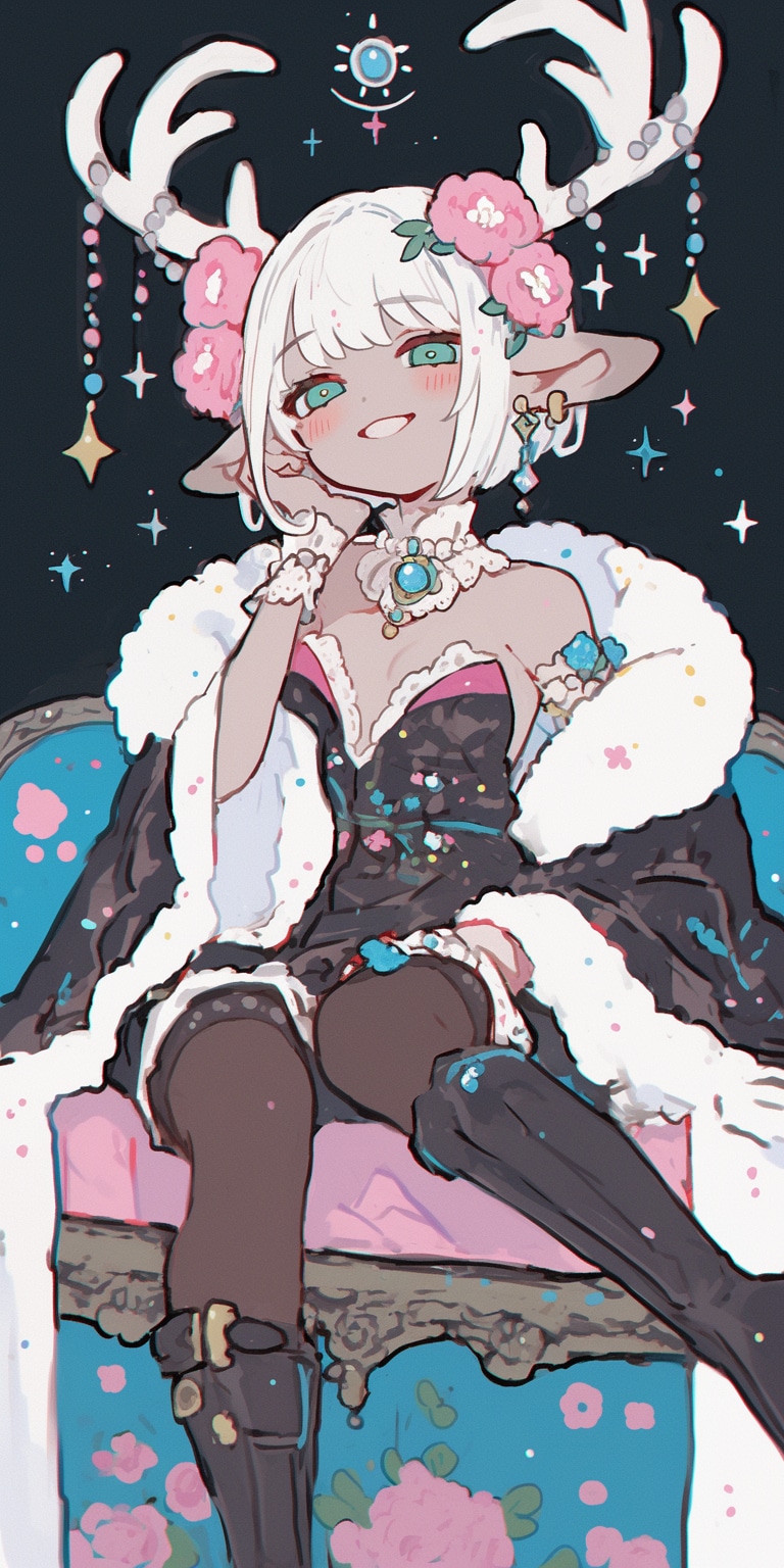 星の煌めきに包まれた鹿の姫。優雅な笑みを浮かべながら、玉座であなたを見つめている。