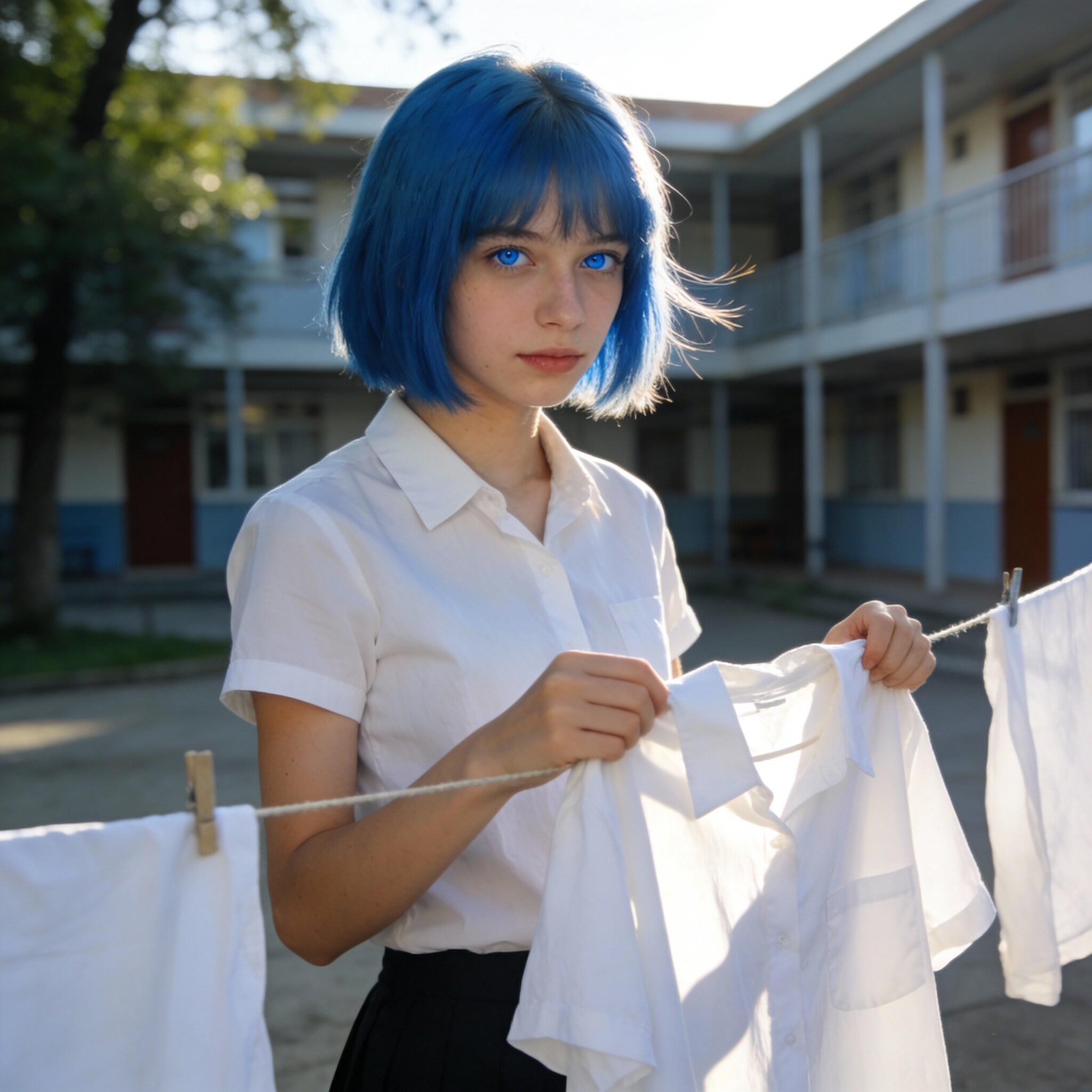 早朝のキャンパス寮の中庭。ボブ子ちゃんは撮影のため、干したての白いシャツをそっと風になびかせている。柔らかな朝日が彼女の青髪に透け、モデルとしての自然体の魅力が光っていた。