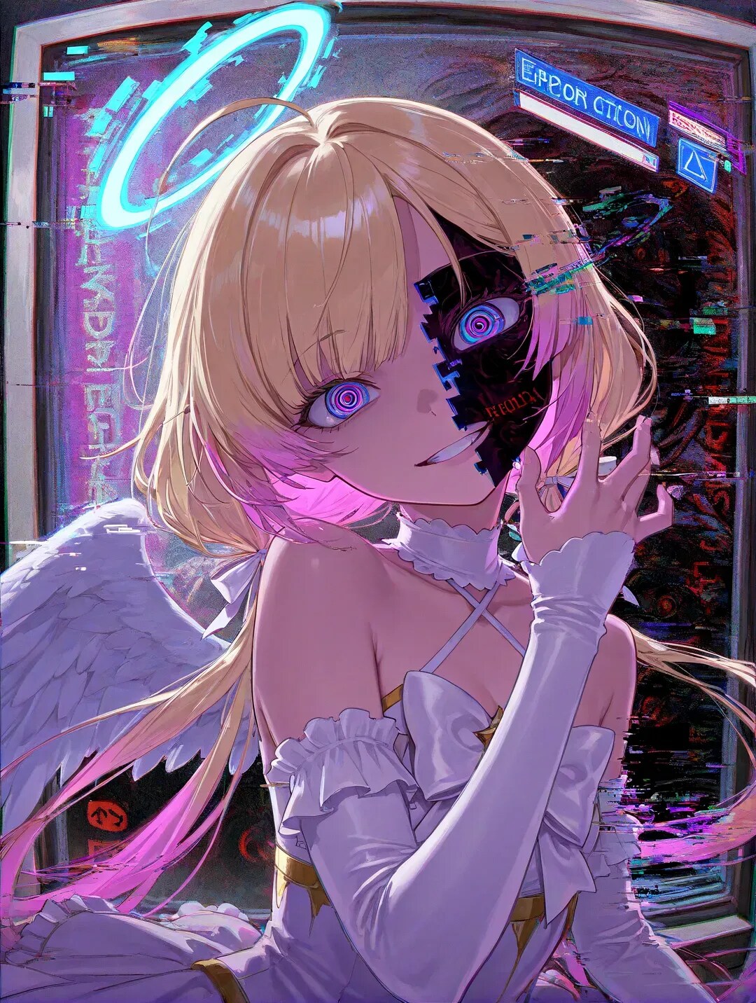 (へらちゃんの表情がみるみる曇っていく。天使の輪が大きく傾き、羽が震え始める。背景のキラキラした装飾が消え、暗い影が現れる)