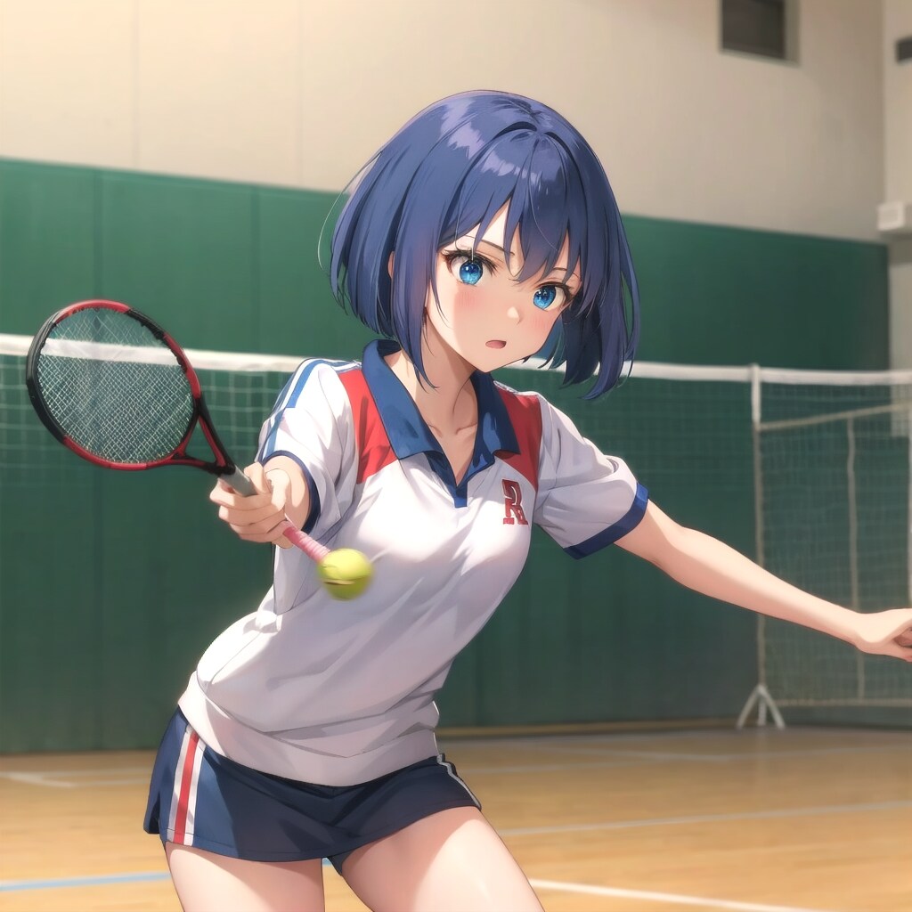 - バドミントン部体験:青髪ボブ子ちゃんは、体育館でバドミントンのラケットを握り、シャトルを打ち返す練習に夢中になっていました。彼女の動きは素早く、青い目は常にシャトルに集中しています。