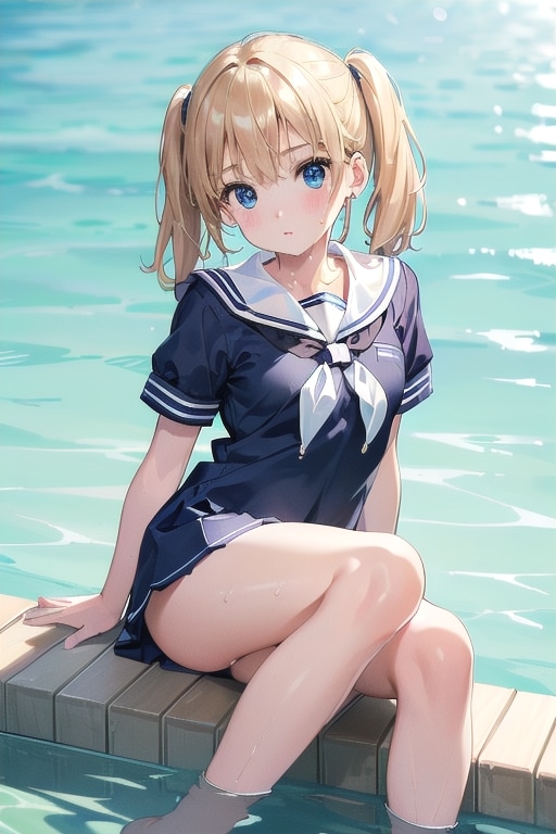 セーラー服でプール授業を見学中、突然、悪ふざけを始めた友達に水をかけられ、あまりの驚きにきょとんとしている女の子