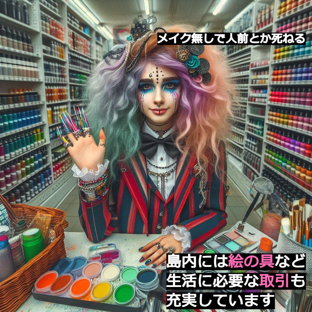 学園の場所は常識から離れた島で、島内には絵の具など生活に必要な取引も充実しています