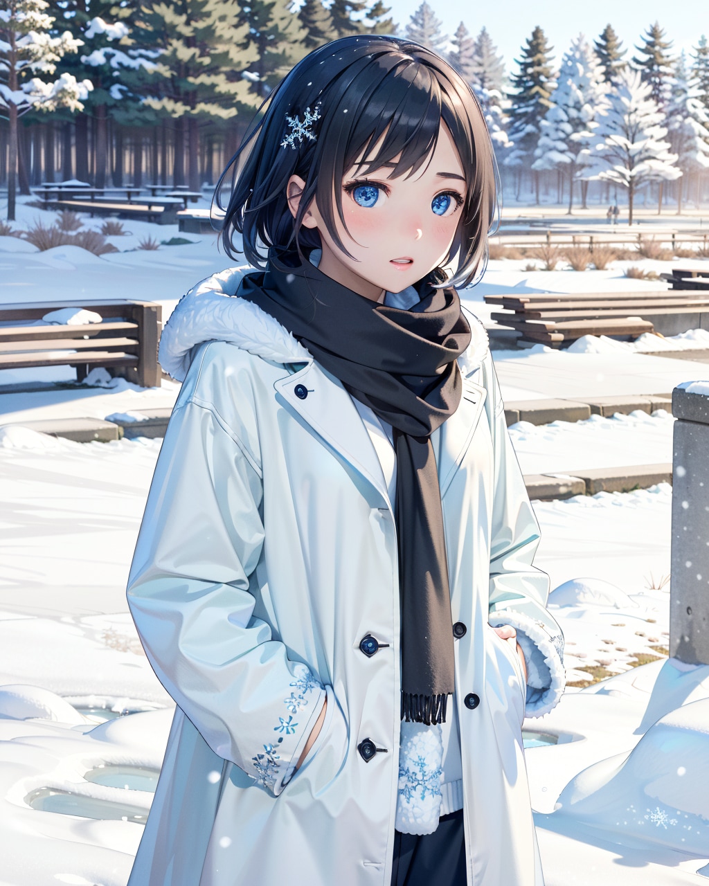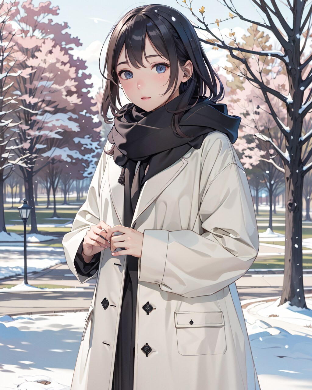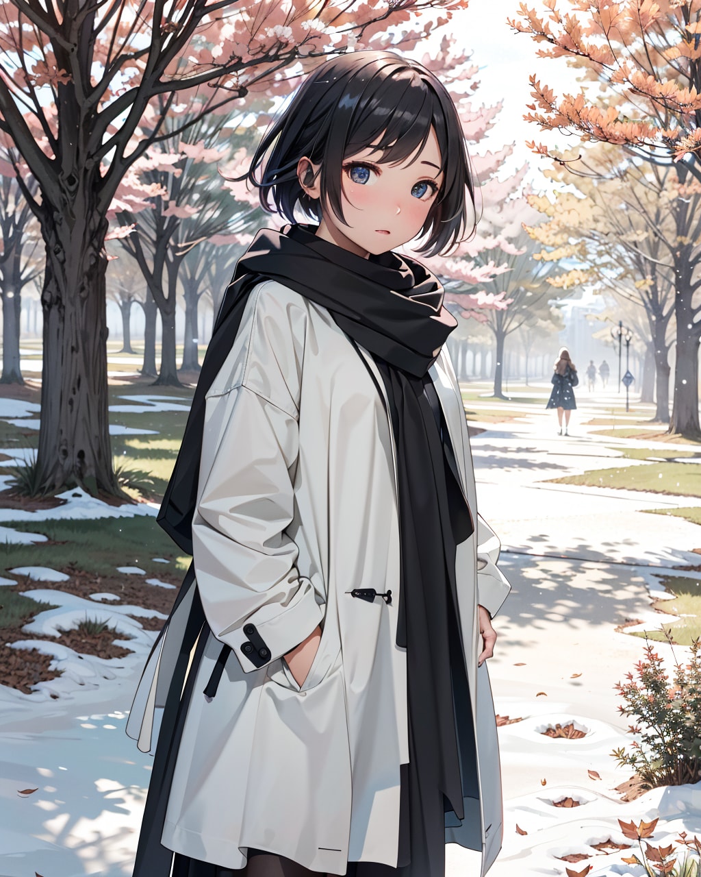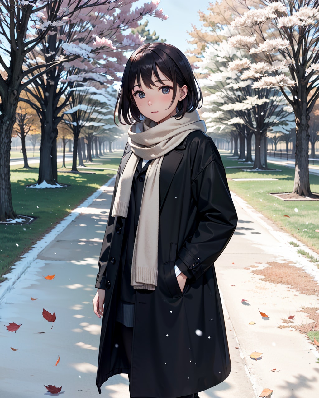 1女の子セーター、ロングコート、マフラー、冬服、アウトドア、昼、雪、公園、草原、落ち葉、かわいい<lora:WinterWonderland_last:0.75><lora:cartoonisationer-21st_ce:1><lora:animeimalist:1>