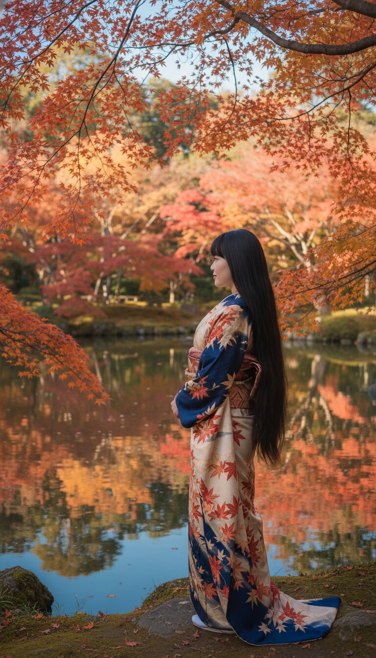 紅葉する日本庭園の池に映る紅葉を見る着物の女性