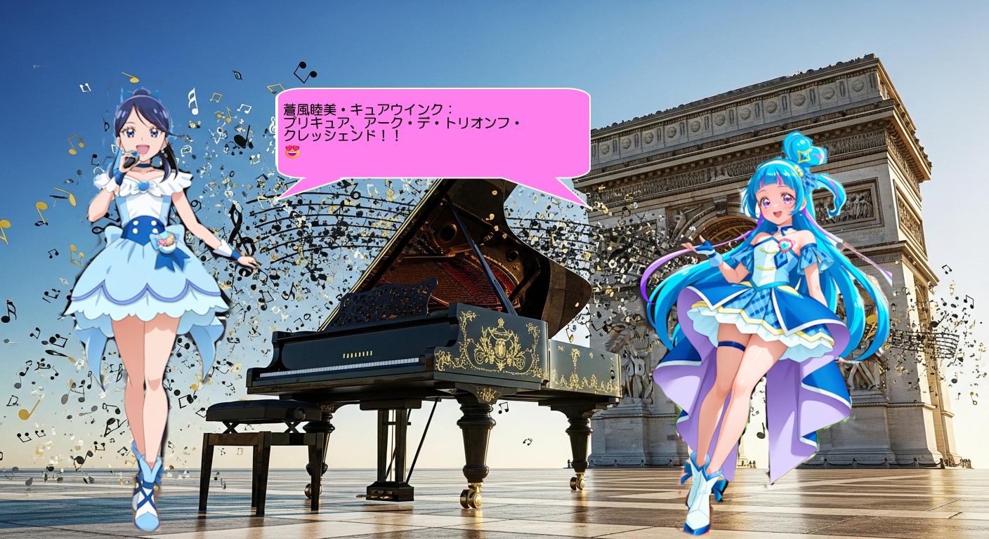 今回は、蒼風睦美がプリキュアの服装を着用して、凱旋門の前で演奏するシーンを描いてみました。