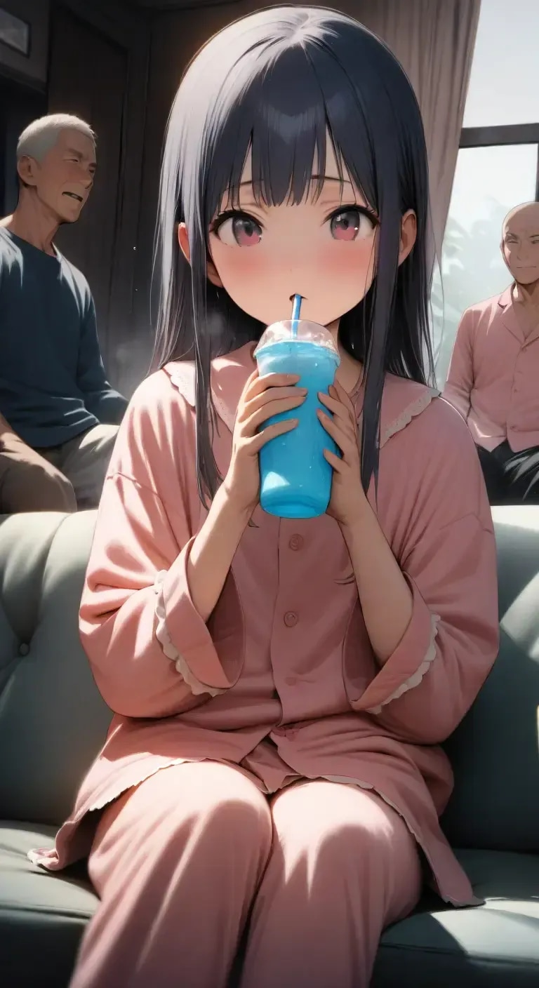 「このジュース、媚薬っていうとっても身体にいいお薬が入ってるから、おじさん達と遊ぶ前に飲みなさい。」