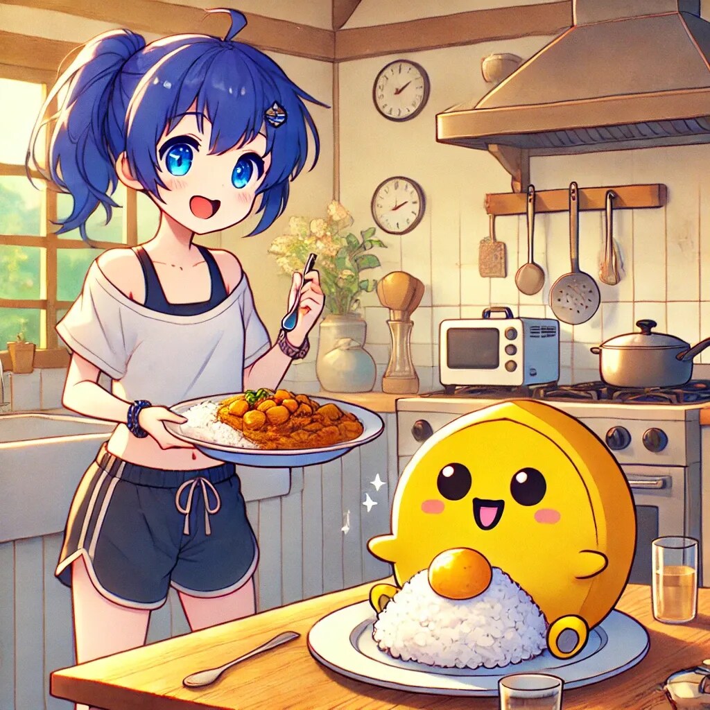 少女が作った愛情たっぷりのカレーライスを、ファットイエローが美味しそうに頬張る様子 は、とても微笑ましいですね!😊💕