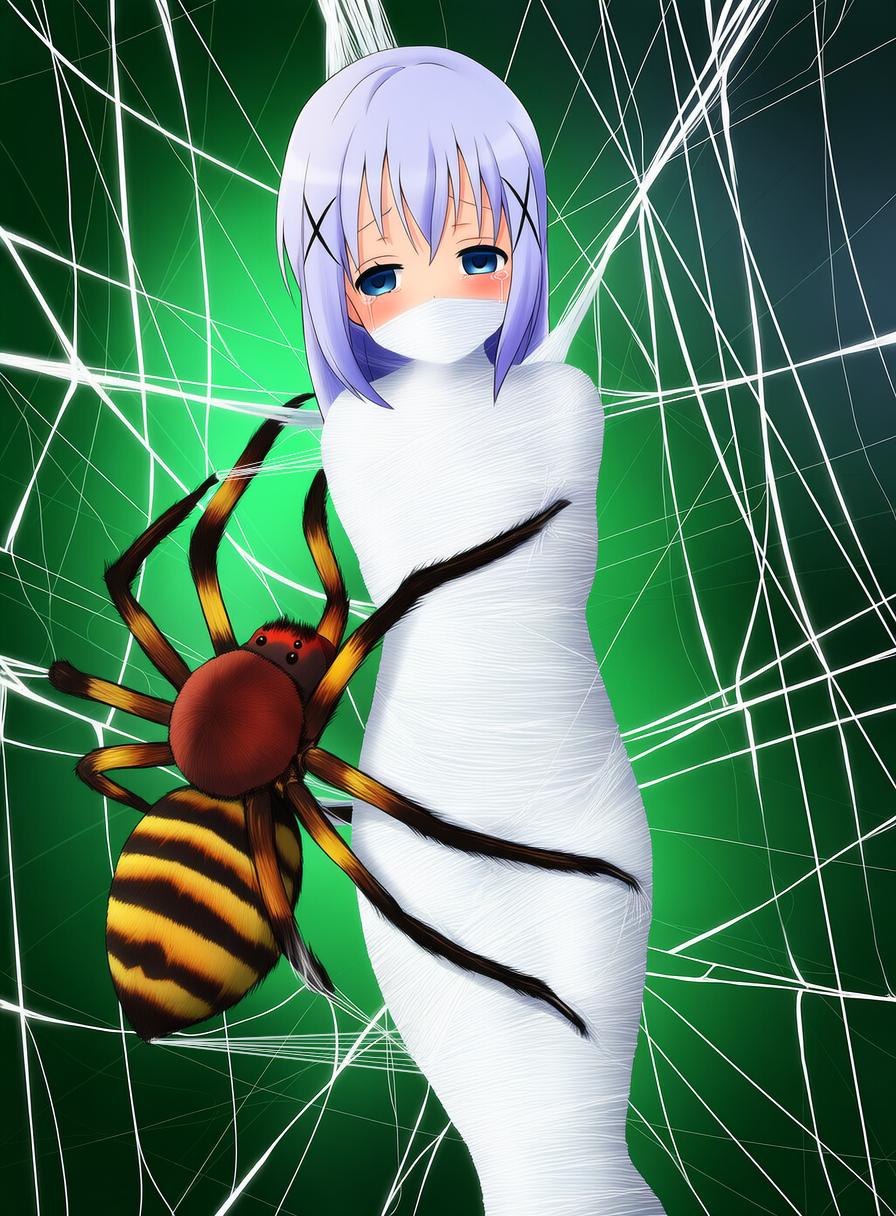 必死に拘束から逃れようと藻掻くが小さくて非力なチノが人間サイズの巨大蜘蛛から逃れる術は無い。