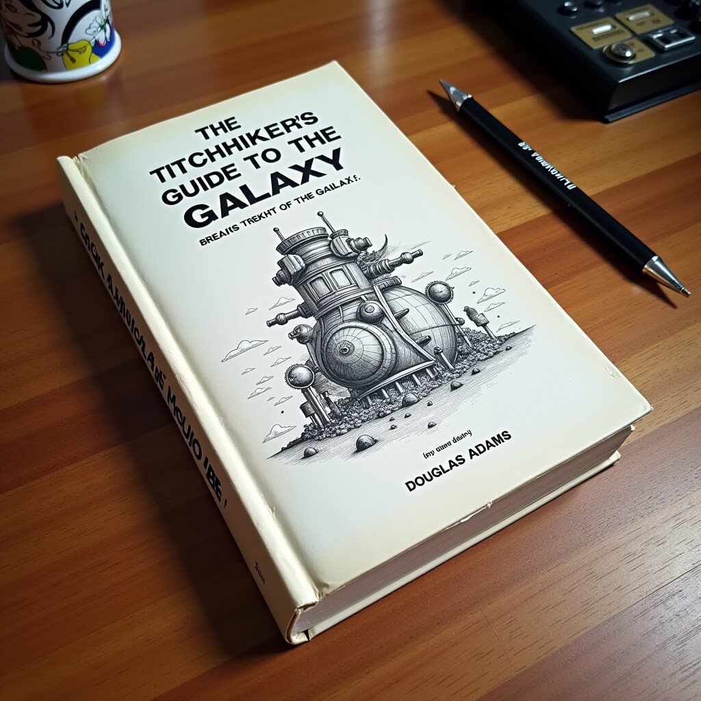 さて、プロンプトコーナーです。ややこしい物はFluxかSD3.5、はたまたGoogle AI Studioという公式になって来ましたw。今回はGoogle AI StudioとFluxにSeedream4.0です。それっぽい物を出してくれました。しかも、1枚目の画像には小説の後ろ側に電子端末が置かれています。これ、もしかして「銀河ヒッチハイクガイド」を出してくれたのですかね?だとしたら凄いな!もう十分過ぎですw。