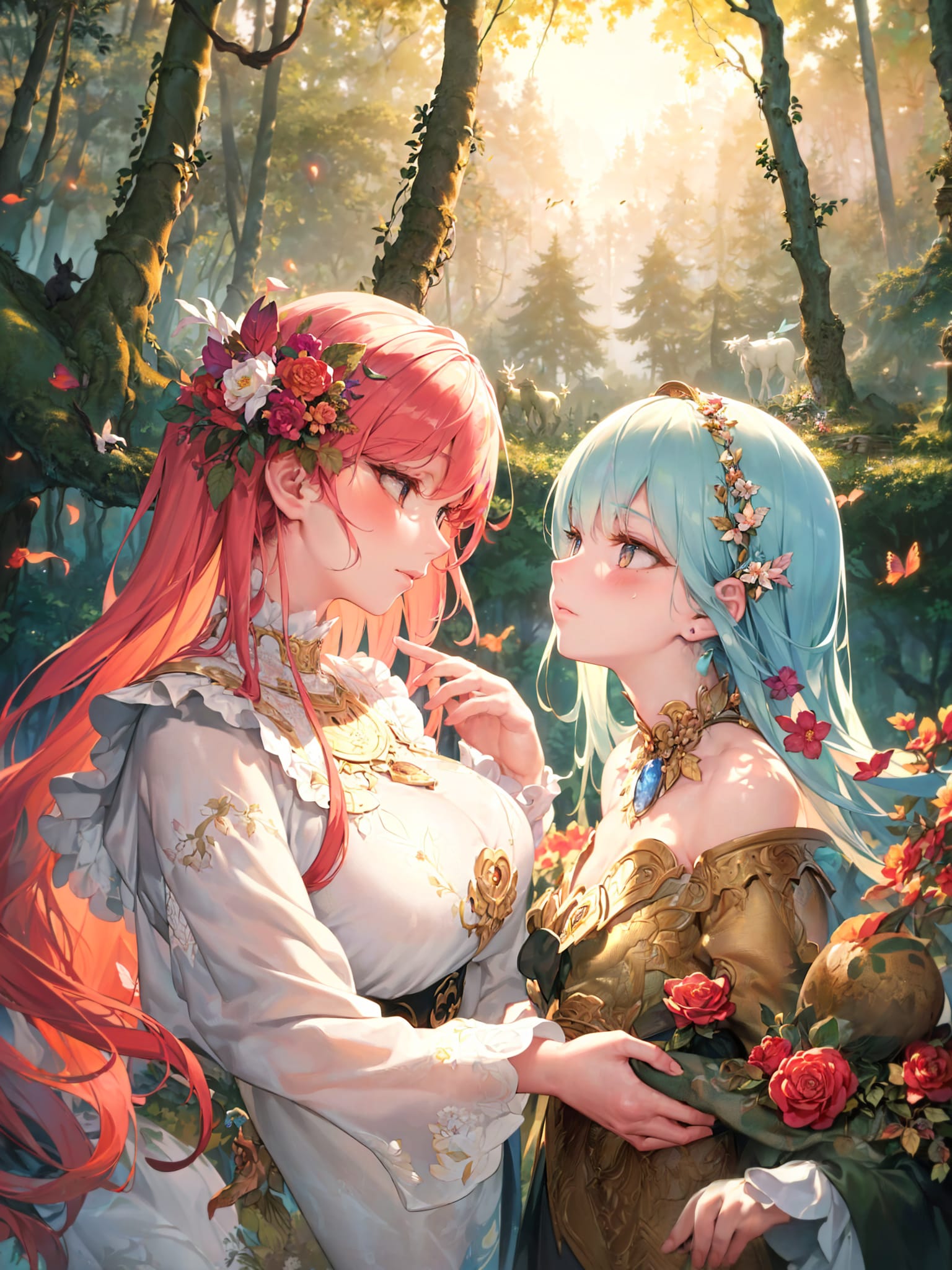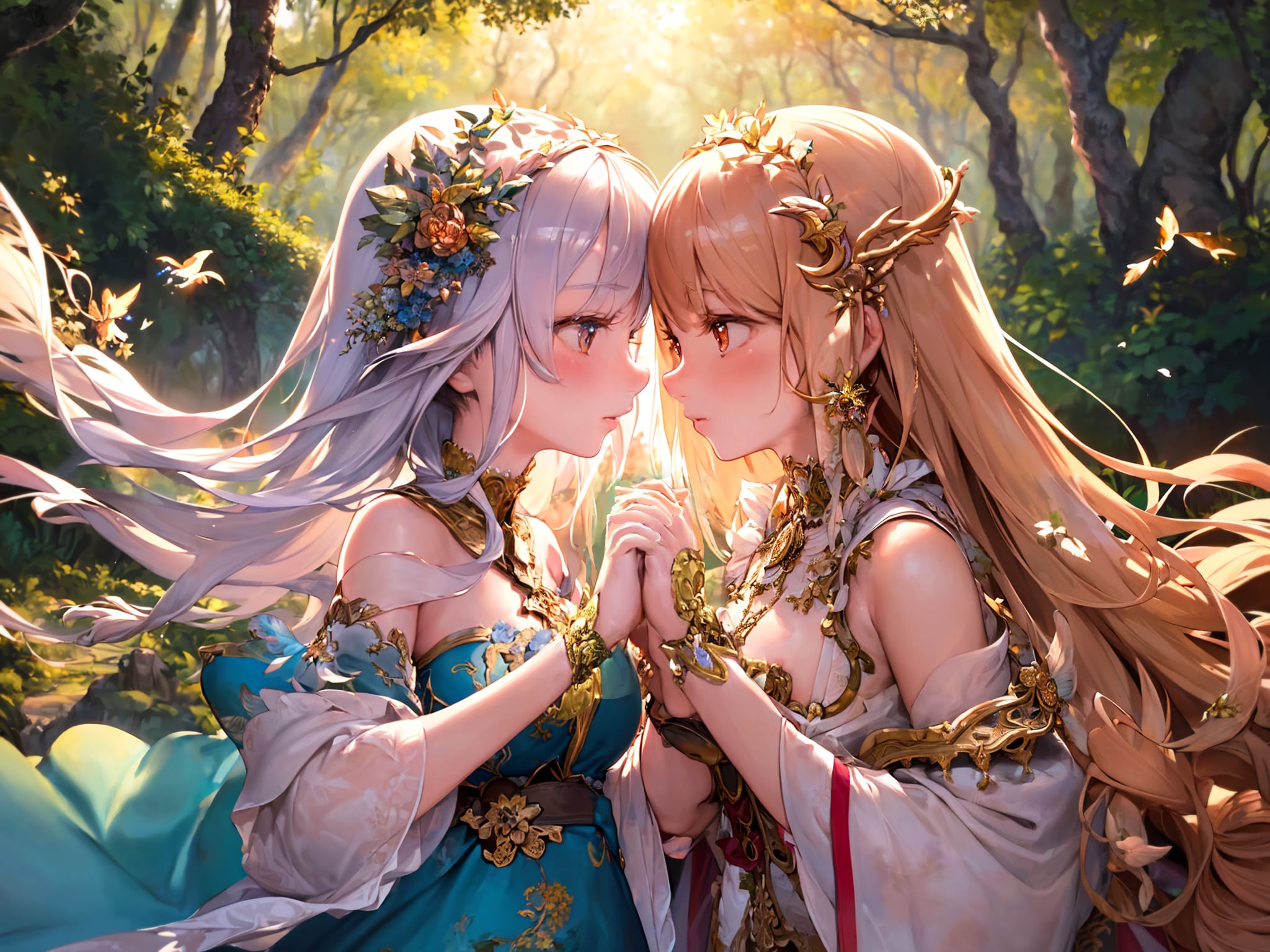 投稿しようと作りためていたものです。文章っぽいプロンプトで何が出るか試したかったというコンセプトです。森の住人たちが助け合いながら生活している様子…みたいのが描かれることを期待していたらなぜか見つめ合うおなごたちばかり!スキあらばすぐに見つめ合う、森の民にとっての助け合いとは…。8割以上がゆりゆりな感じの出力だったのでそれらをまとめました。