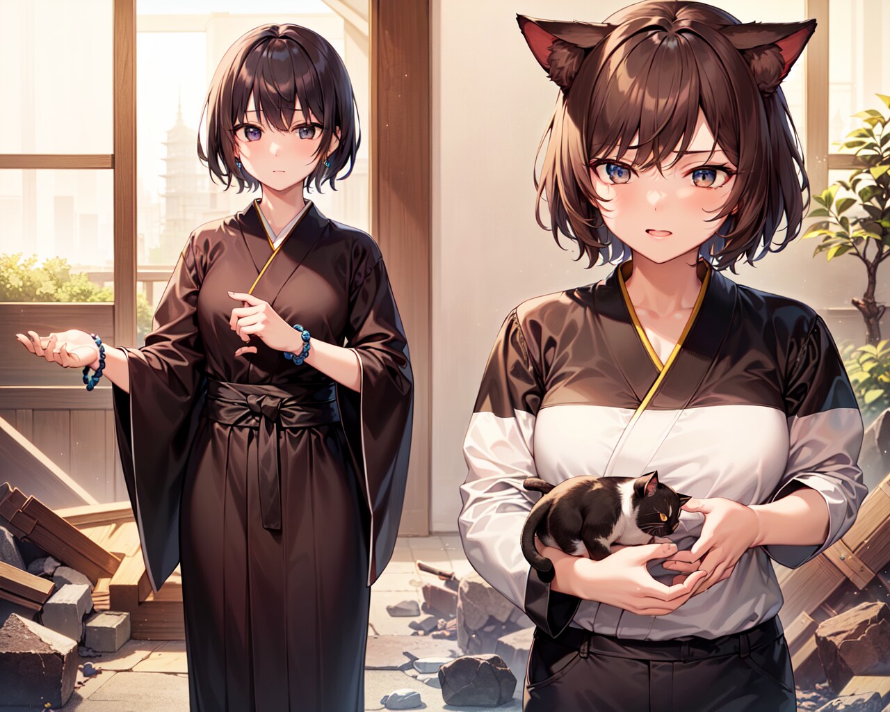 魔物被害に遭った建物の調査で猫を保護する猫娘と僧侶