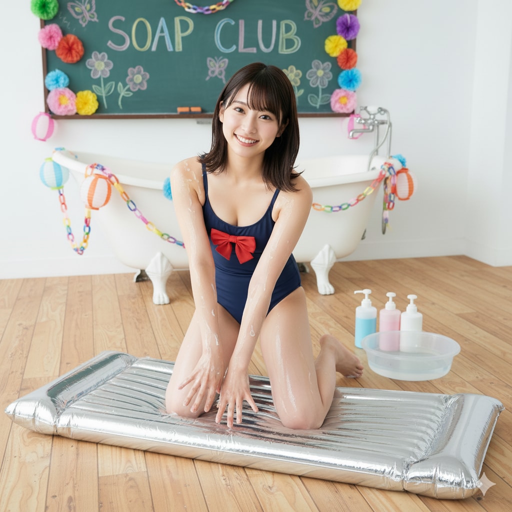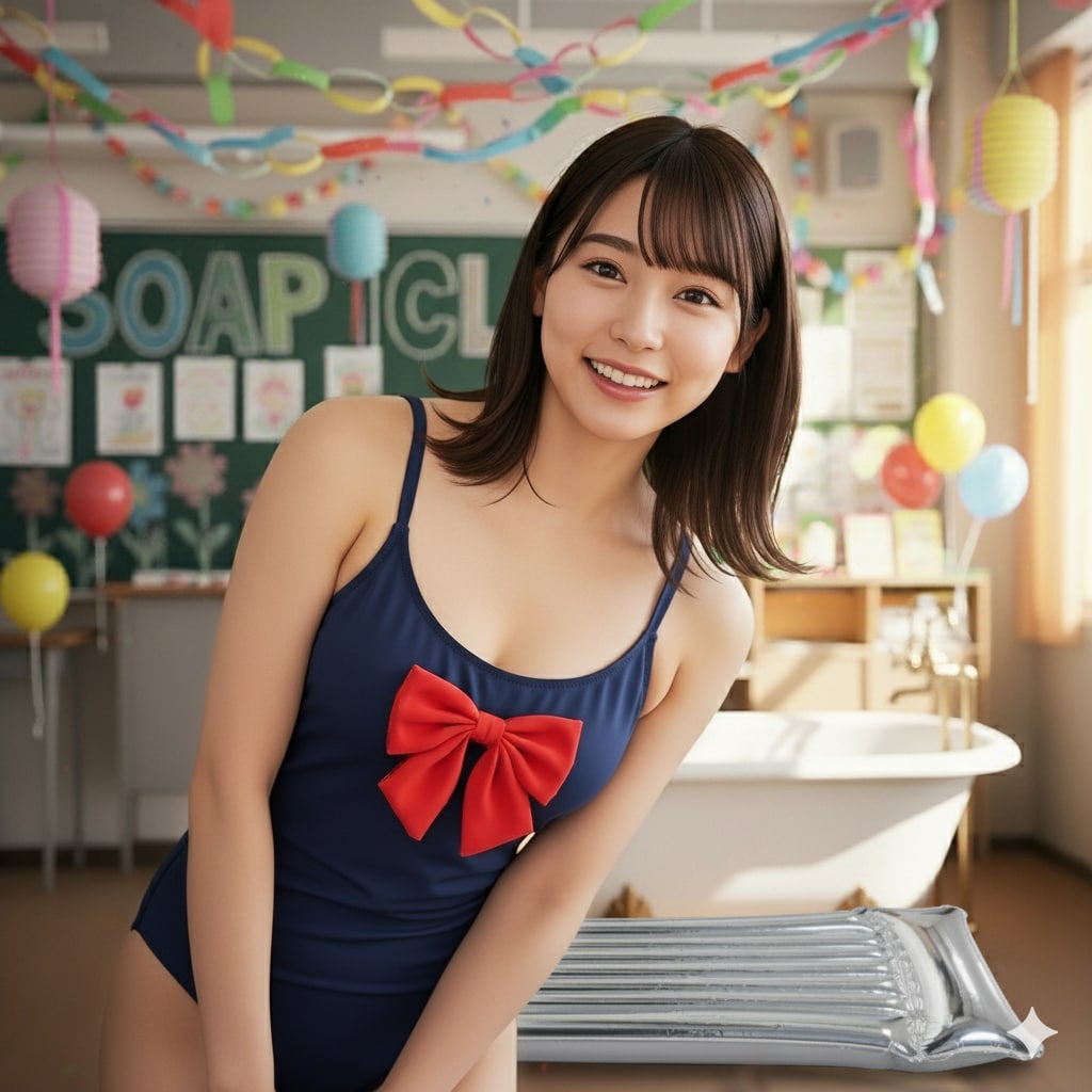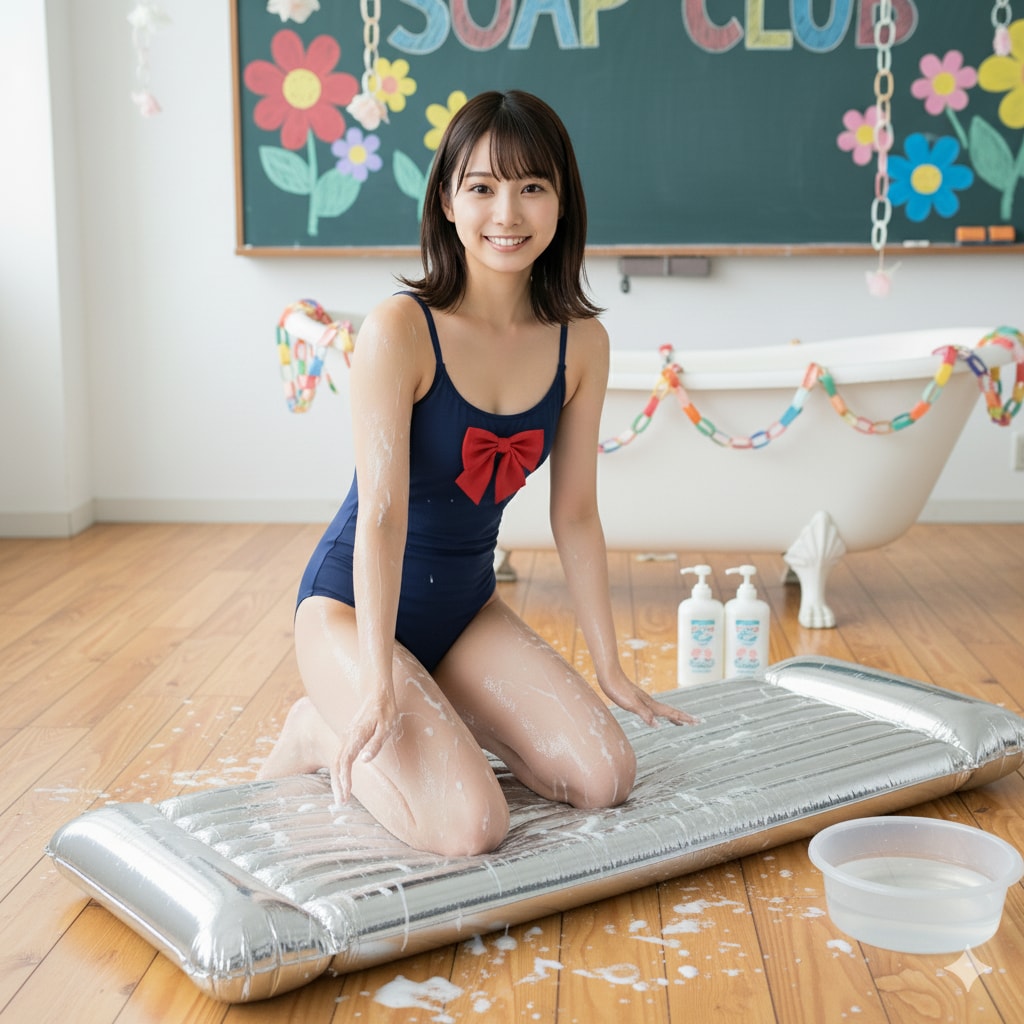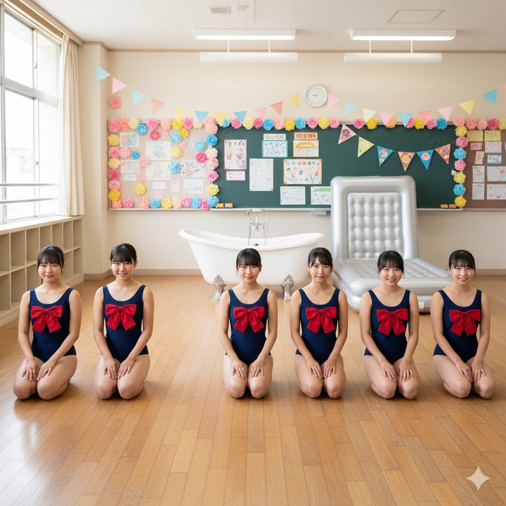 教室のど真ん中に堂々と鎮座するバスタブと銀色のエアマット。