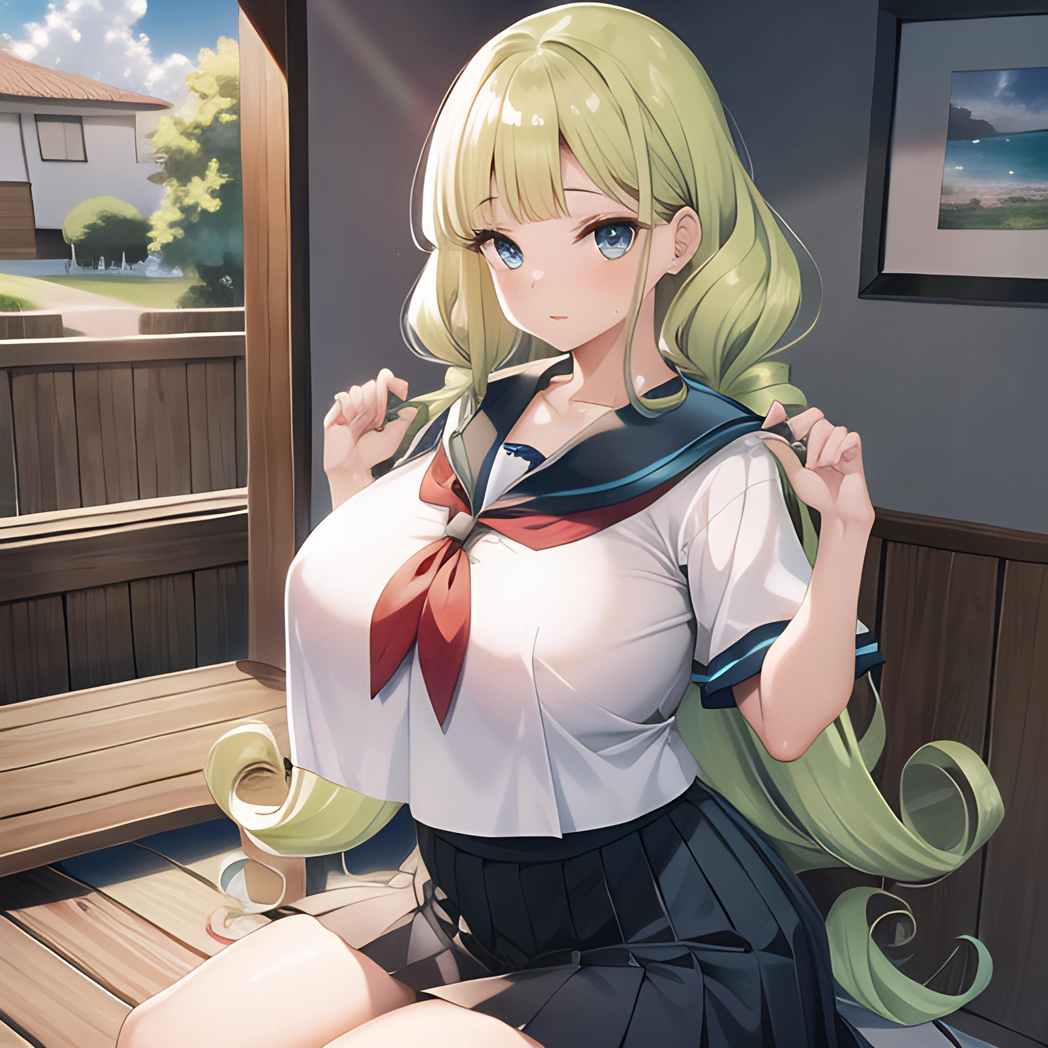 例のあれなセーラー服の形状も自分の理想通り(前側の垂れた着丈は正面からだとおへそ見えるか見えないかくらい)だったのに…!😭(サムネは再生成3回目、元画像は2枚目)