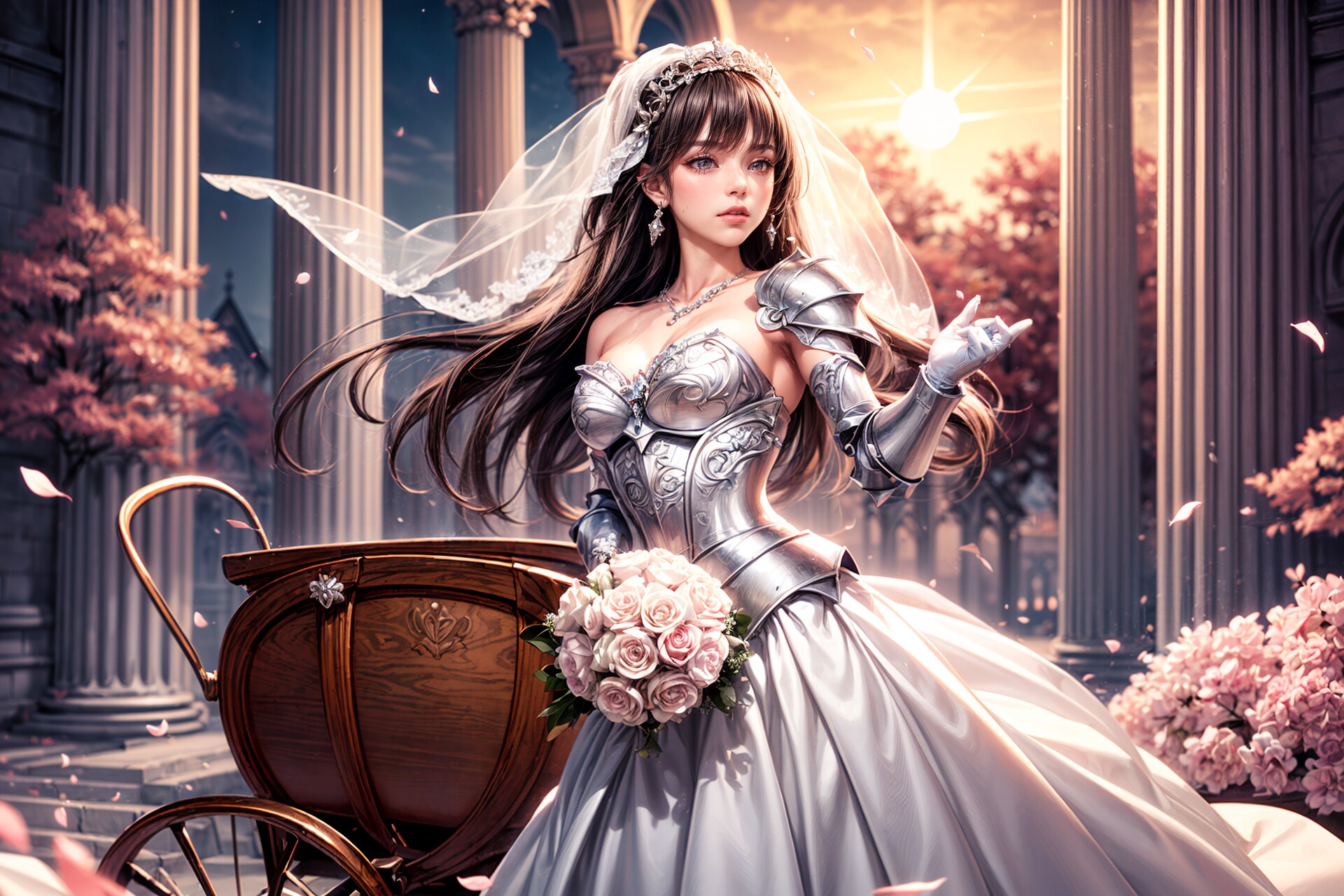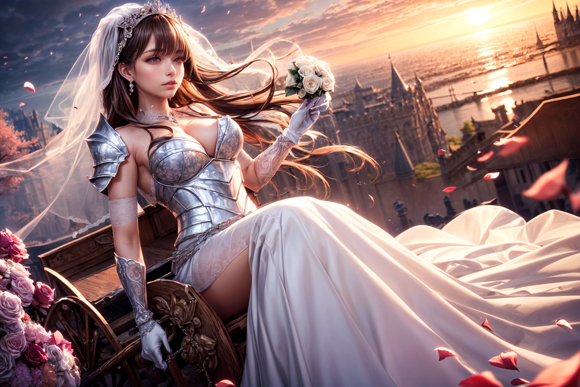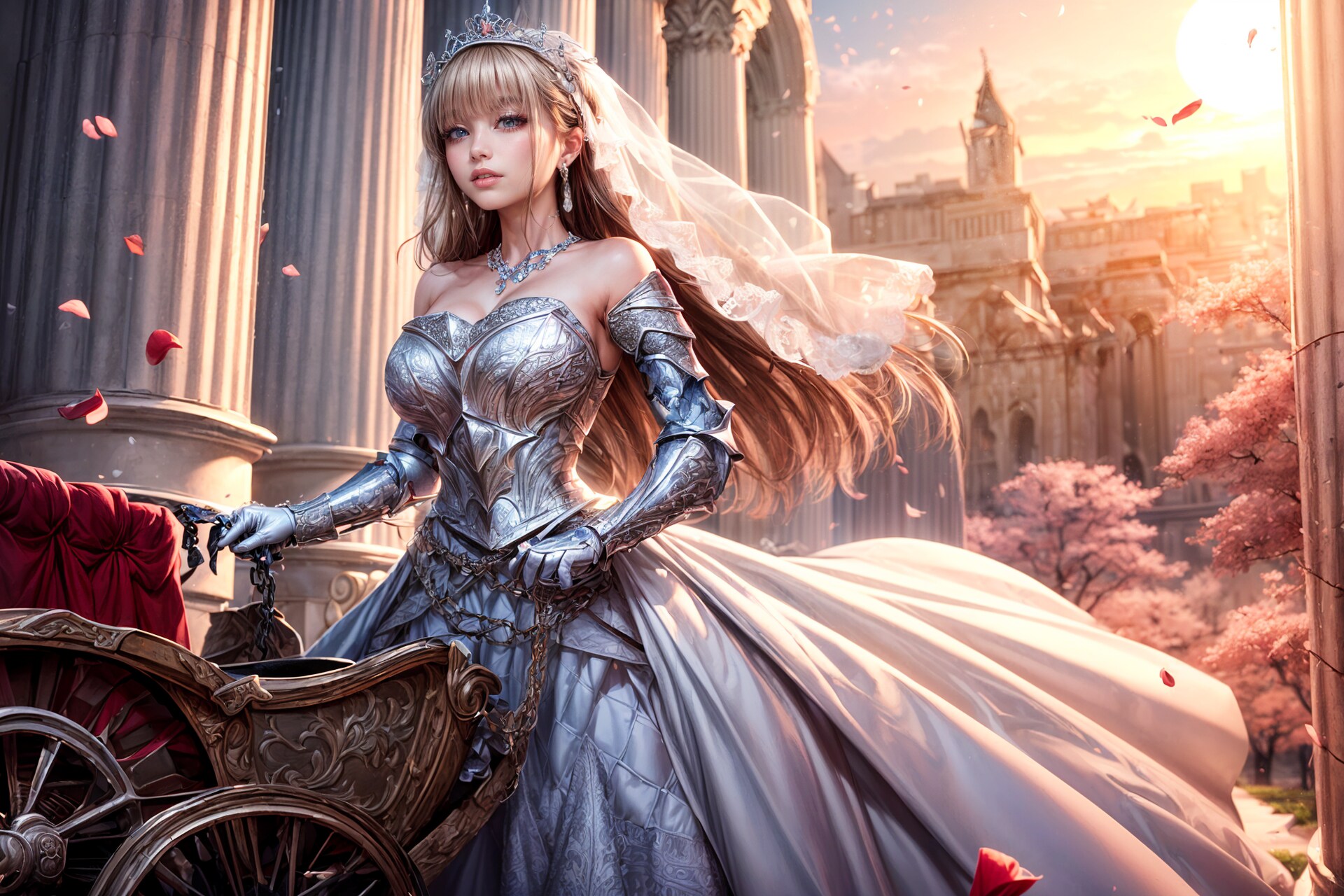 戦時下のウェディングアーマーをまとった姫が夕日に照らされ、馬車に乗って迎える結婚式