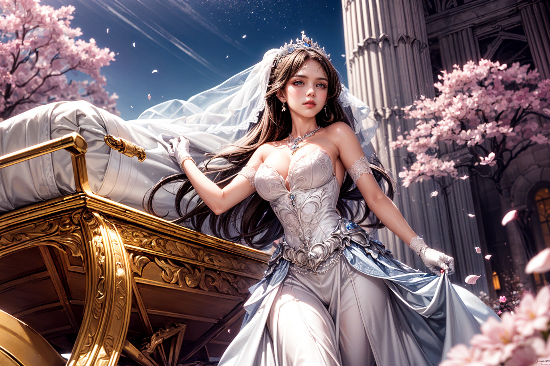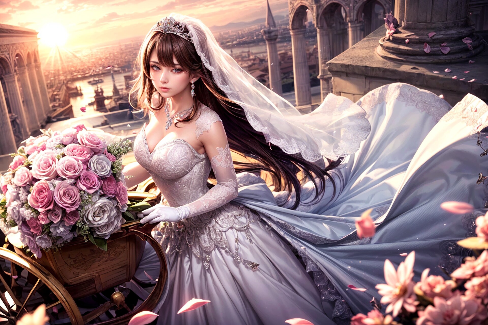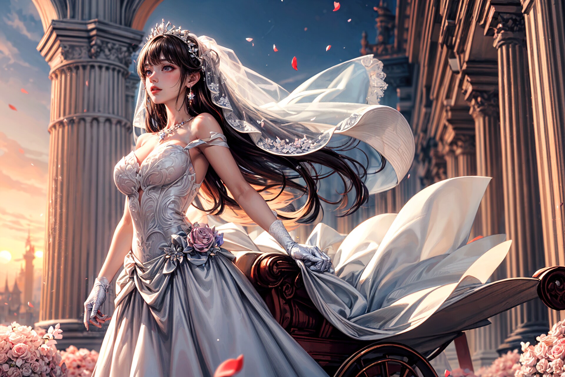 戦時下のウェディングアーマーをまとった姫が夕日に照らされ、馬車に乗って迎える結婚式