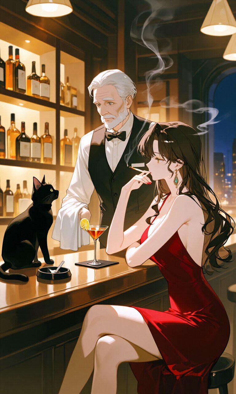 ちょっとびっくりしてるバーテンダーと、猫を見つめるおねーさん