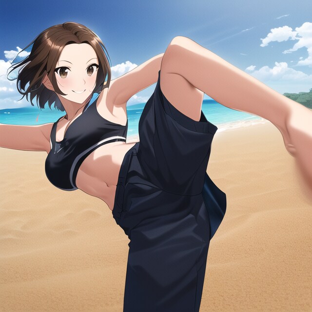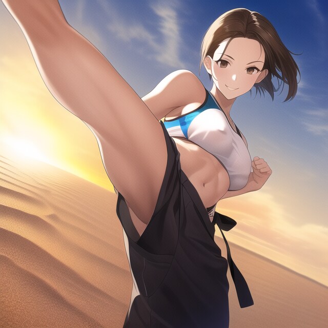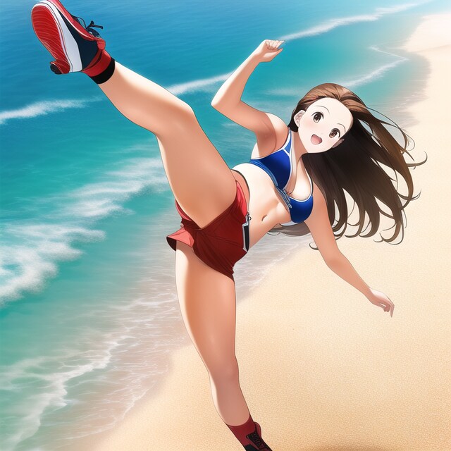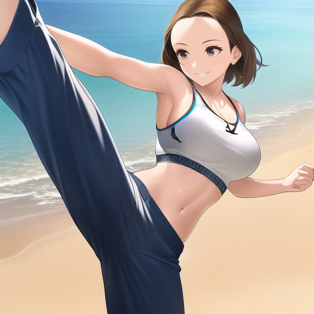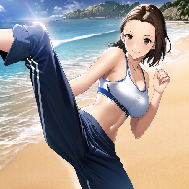 ビーチにてスポブラ&ジャージで蹴りの練習をしている女の子