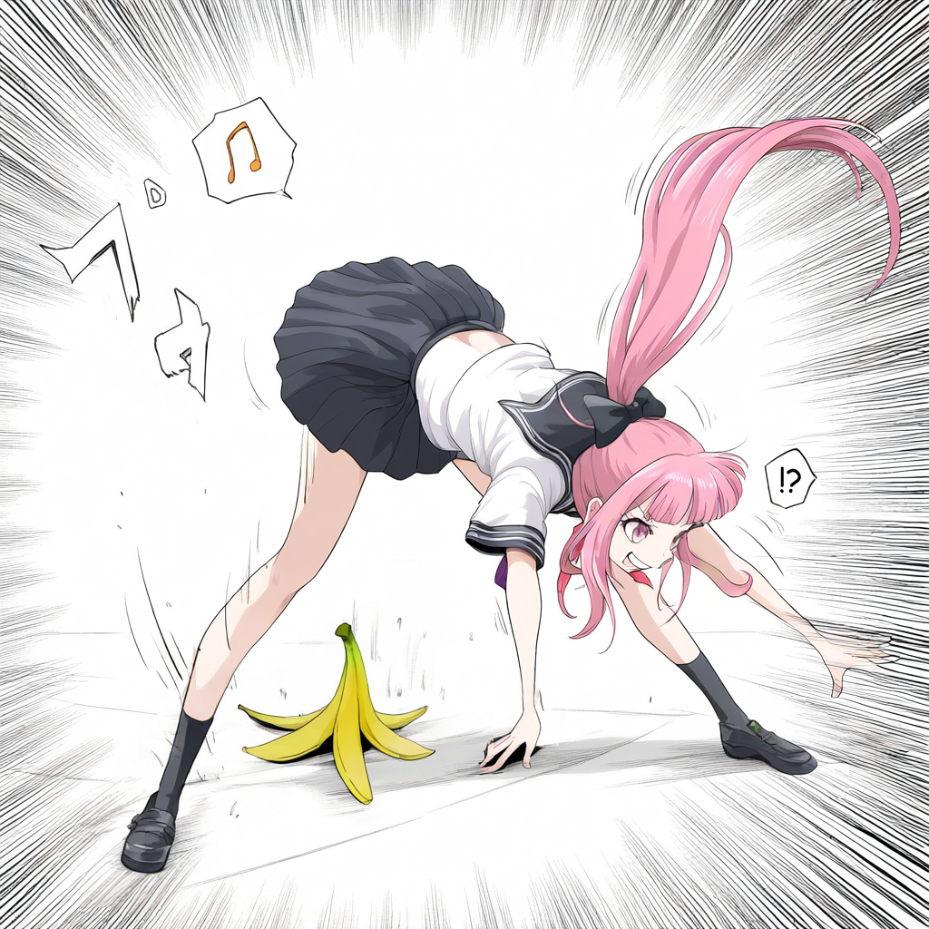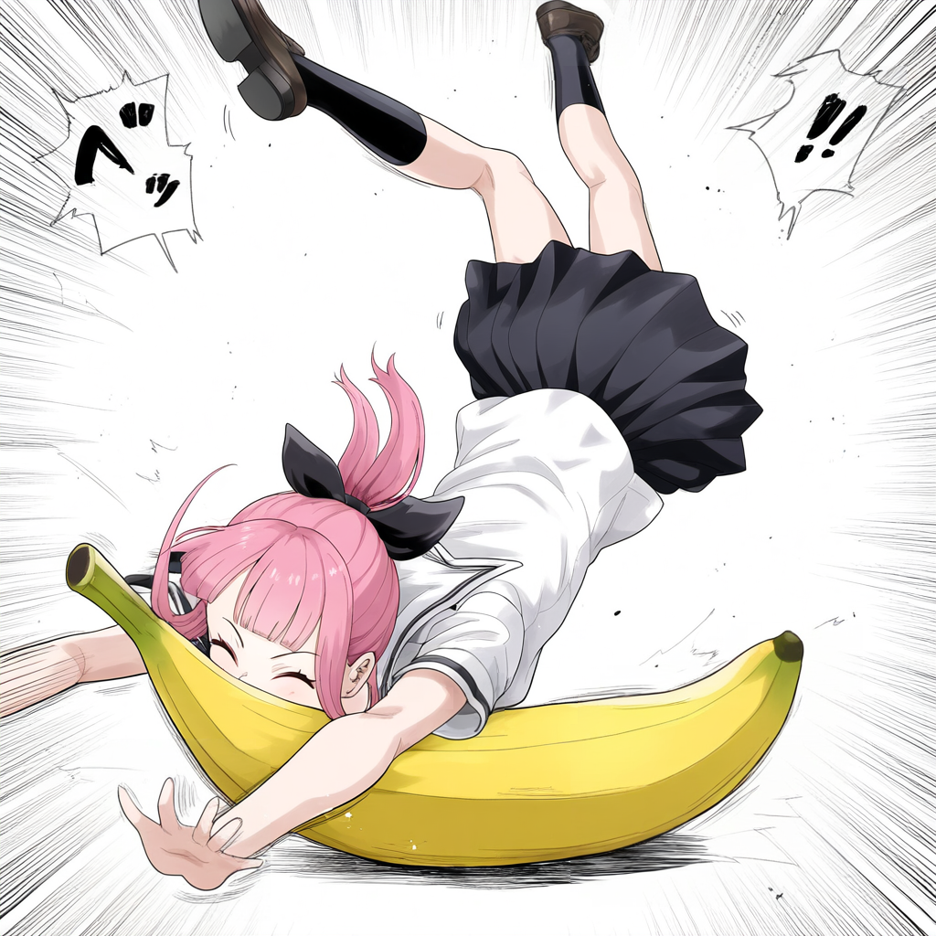 髪型は黒髪のツインテールだったので修正、バナナとセリフはinpaintで追加していきました。