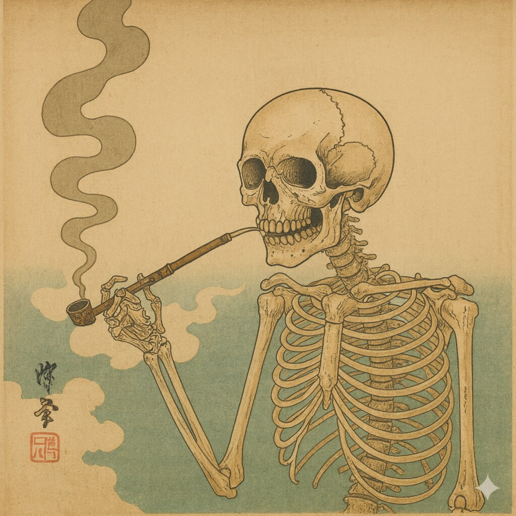 骨だけで まだ一服と 洒落を言い 煙の輪くぐる 夜更けの月よ