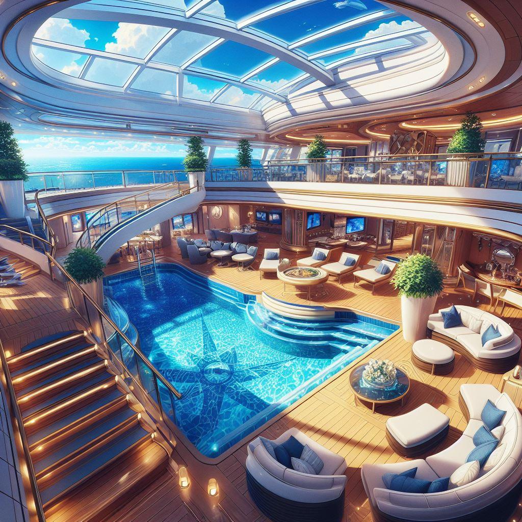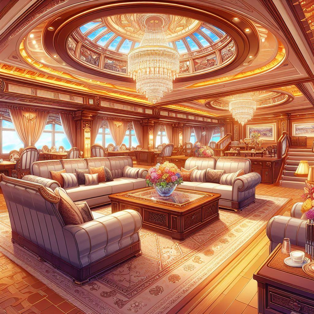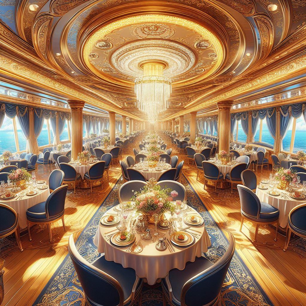 2、船内レストラン1。中央には玉座を模したモニュメント。様々な国の料理が楽しめます。