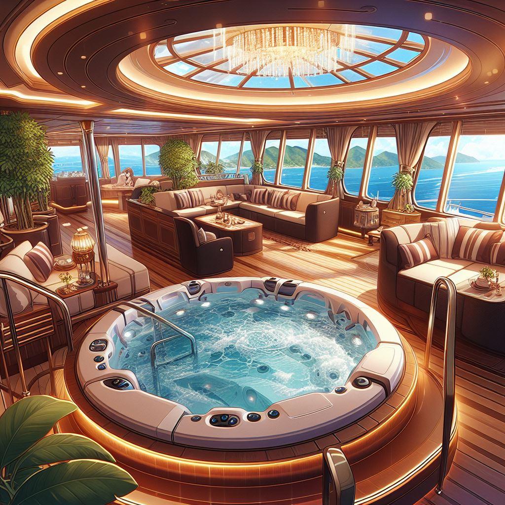 10、船室4。ロイヤルスイートの浴室。舵輪を模した黄金の蛇口ハンドル。ジャグジー機能搭載。