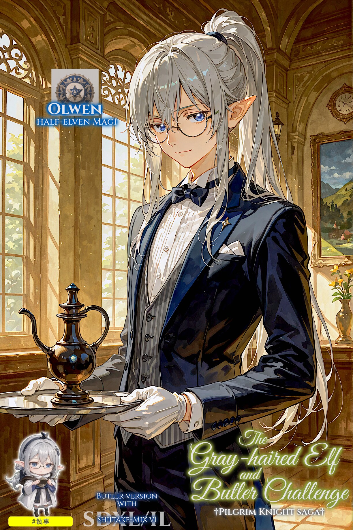 こうした執事愛がこもった企画、なんちゃって執事でなくプロ執事で挑むべきでは...と思ったのですが、当方の作品世界のキャラ達に専業執事がおりませぬ。ならば変装じゃ、ということでファンタジー世界が舞台の「巡礼騎士シリーズ」で旅をしている魔術師オルウェンさんが元から眼鏡なので、執事チャレンジしてもらいました。