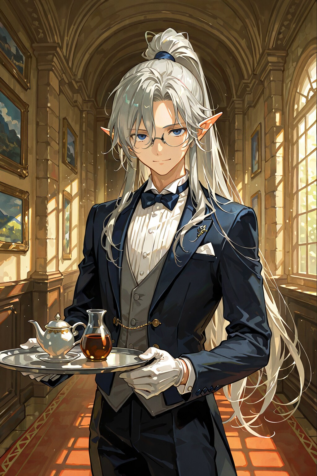 ・人物の指定はもとから眼鏡をしているのでOK、服装に執事のbutler, suit, bow tie, gloves,で手袋も嵌めたらそれっぽくなりました。オルウェンさんは灰色の髪を後ろで結んでいるのですが、今回はlow ponytail→high ponytailに変えています。