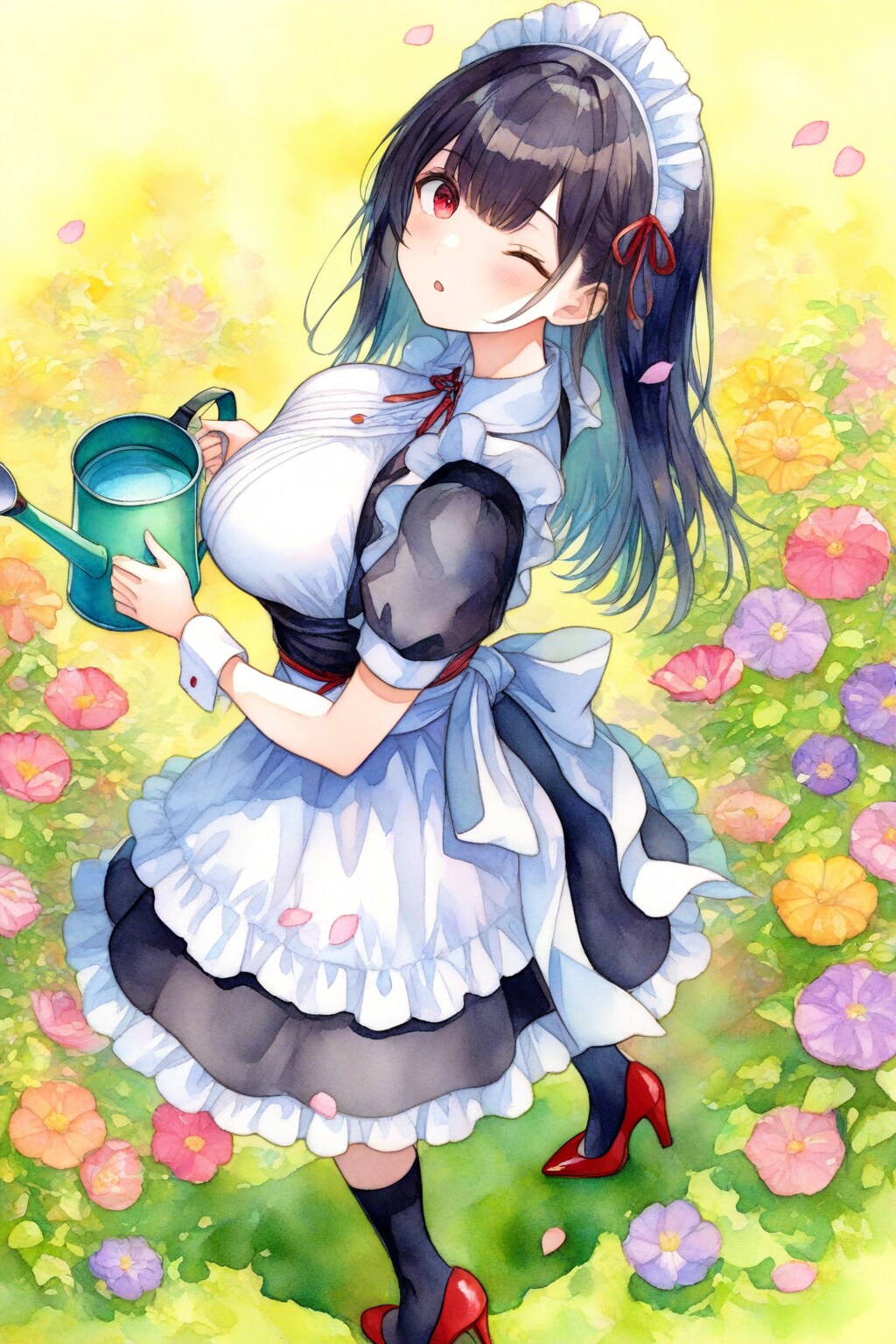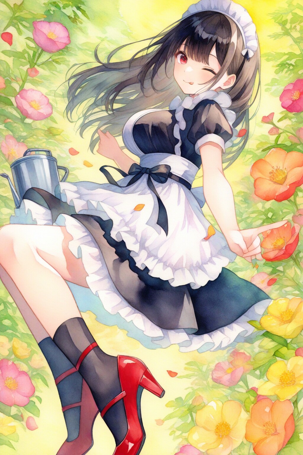 植物に水遣りする黒髪メイド